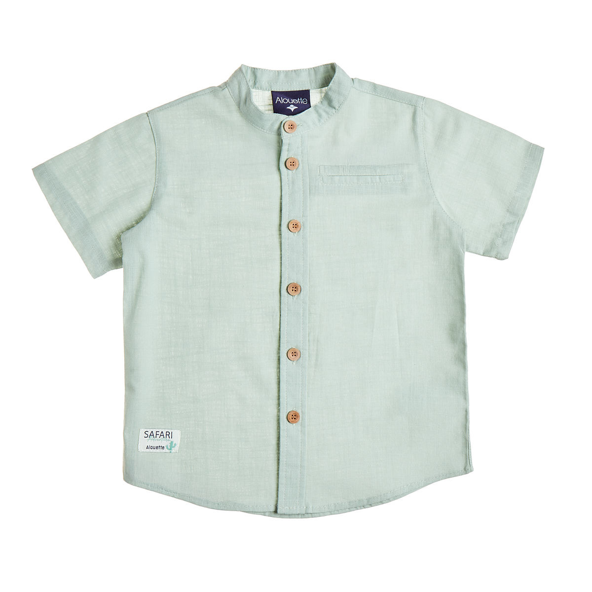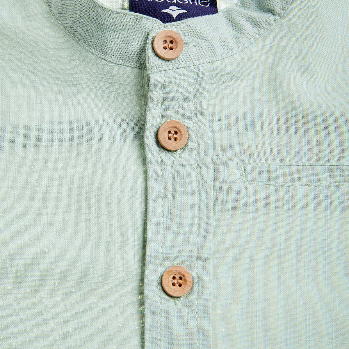 Πουκάμισο με γιακά μάο, διακοσμητικό τσεπάκι μπροστά, patch στο κάτω μέρος και κουμπιά με όψη ξύλου.