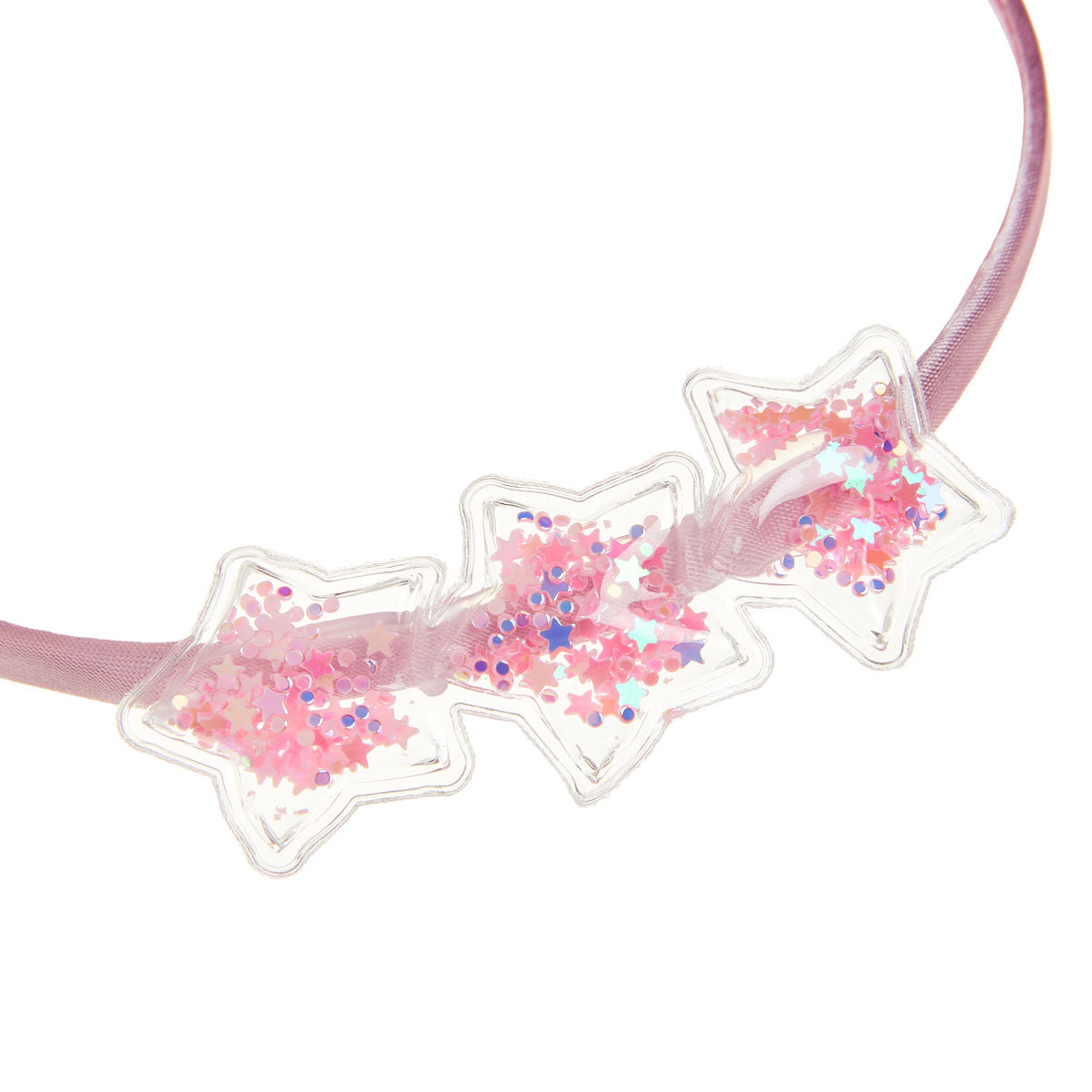 Λεπτή στέκα για τα μαλλιά ντυμένη με ύφασμα και διακοσμημένη με απλικέ σε σχήμα αστεριών γεμισμένα με ροζ κονφετί.
