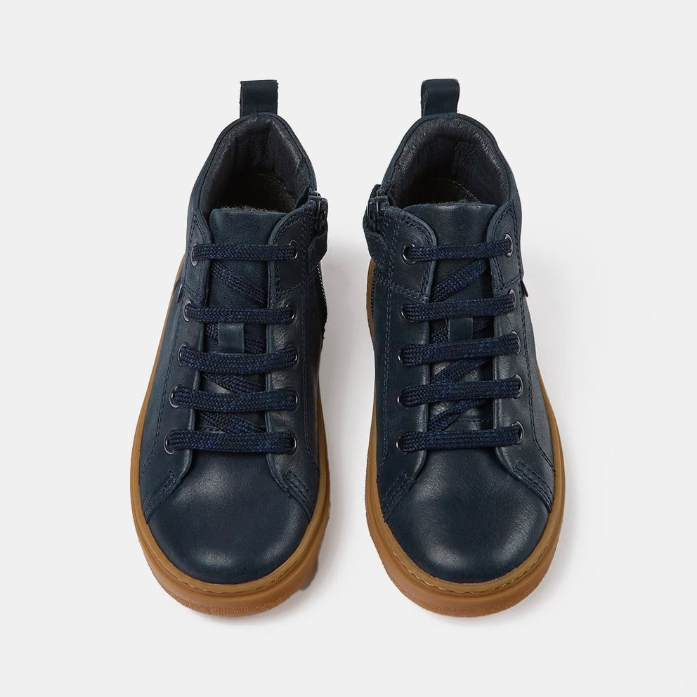 Μπλε navy δερμάτινα παιδικά μποτάκια με αφαιρούμενους πάτους OrthoLite® Recycled™ και εξωτερικές σόλες από λάστιχο.