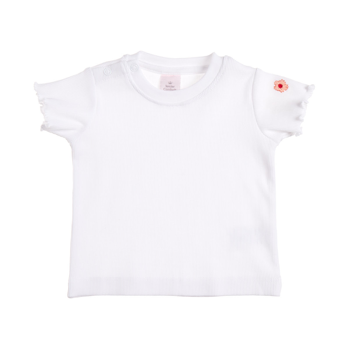 Μπλούζα ρίμπ με κυματιστό τελείωμα στο μανίκι, κουμπάκια στον ώμο για μεγαλύτερη ευκολία στο άλλαγμα και κέντημα στο μανίκι.