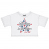 Η μπλούζα είναι cropped, έχει κοντό ελαστικό μανίκι, στρογγυλή λαιμόκοψη και τύπωμα με glitter στο μπροστινό μέρος.