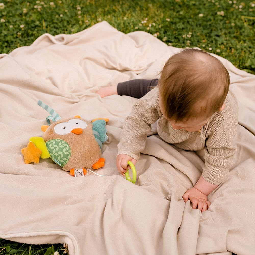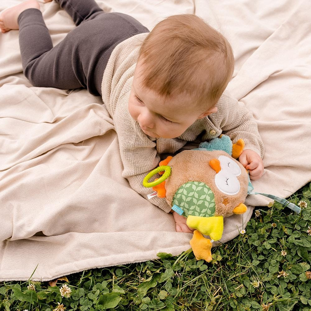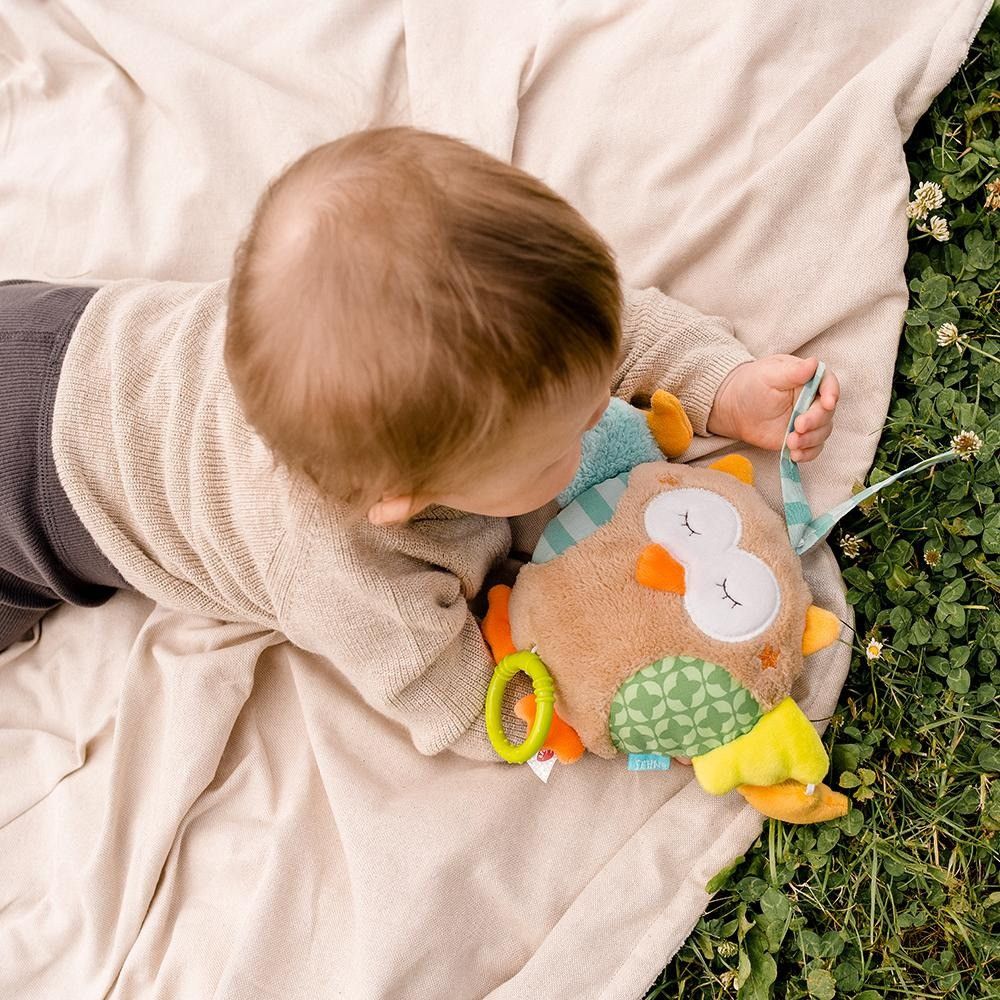 Χάρη στο εύκολο σύστημα στερέωσης, η κουκουβάγια μπορεί να συνοδεύει το μωρό στην κούνια, στο καρότσι ή στο πορτ-μπεμπέ, στο σπίτι ή εν κινήσει. Το κουδούνισμα αφαιρείται για πλύσιμο και η κουκουβάγια πλένεται στους 30°C.