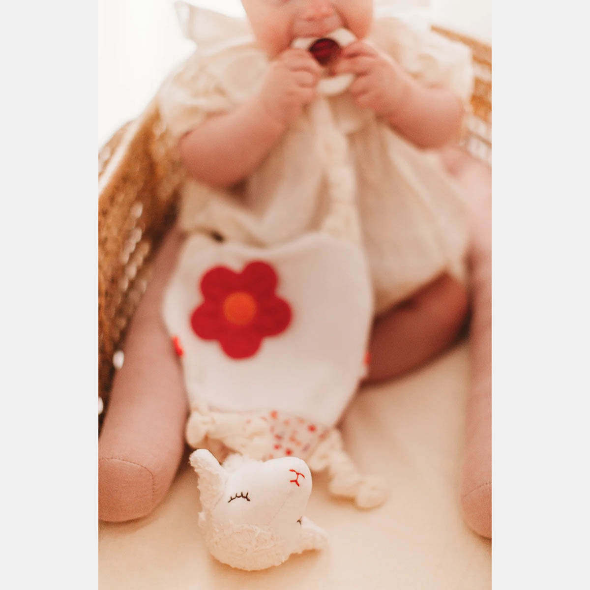 Κρύβει μικρές εκπλήξεις που ενθουσιάζουν τα μικρά χεράκια: ήχους από τσαλακωμένο υλικό, ένα γλυκό κουδουνάκι, μια παιχνιδιάρικη σφυρίχτρα και έναν μεγάλο δακτύλιο από φυσικό καουτσούκ, ιδανικό για ανακούφιση κατά την οδοντοφυΐα.