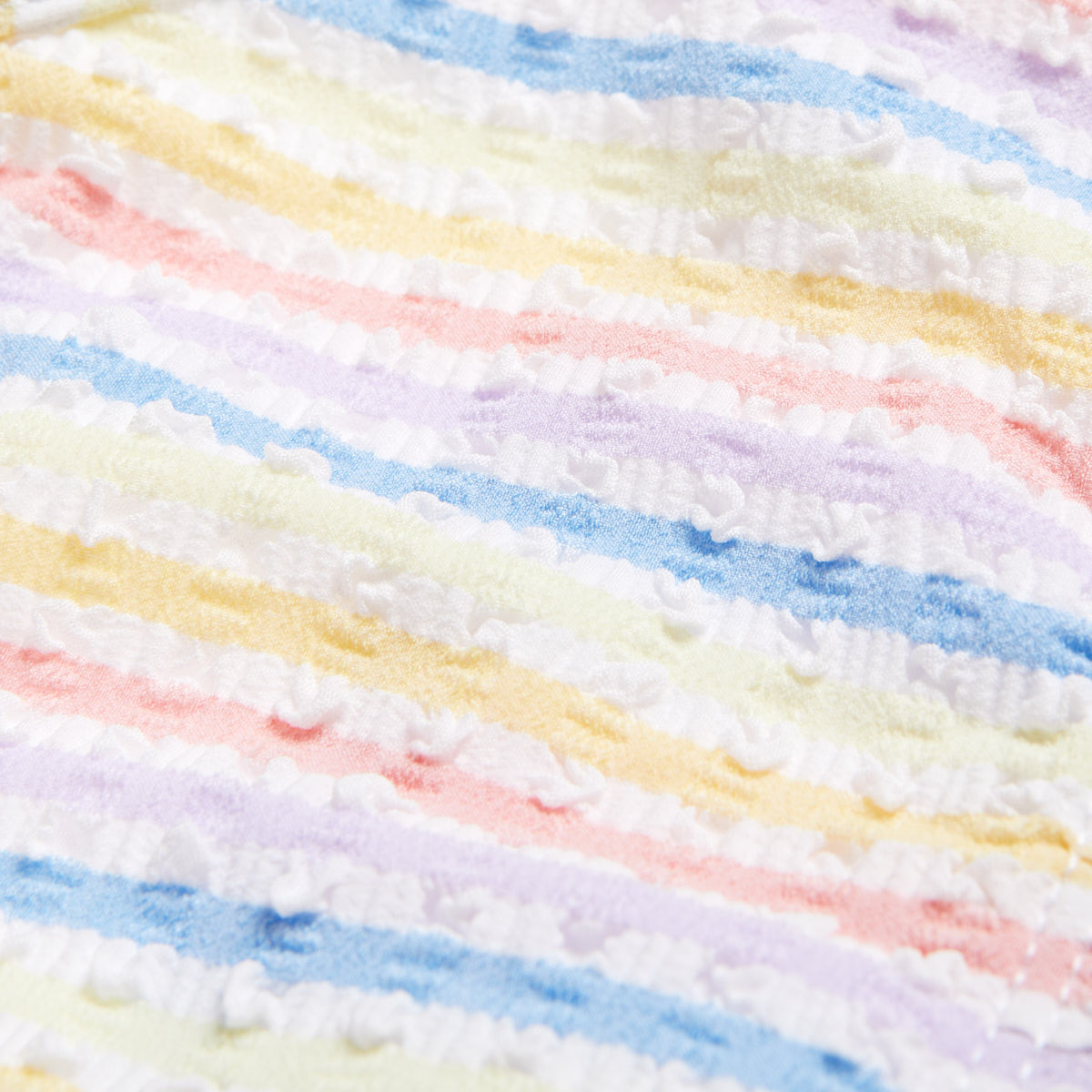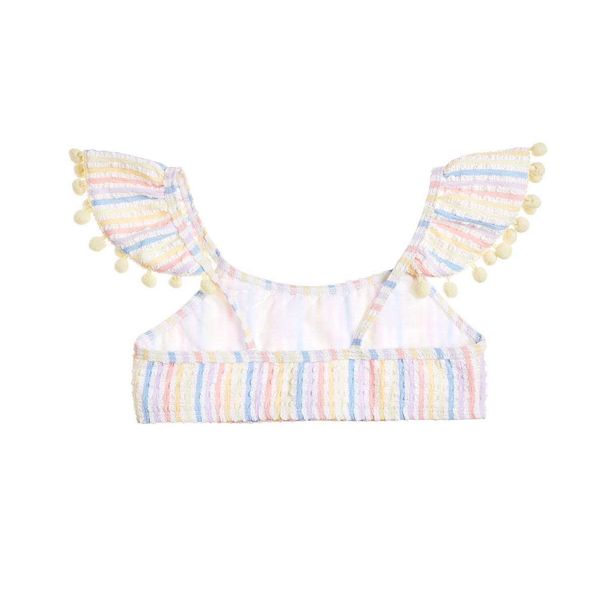 Μπουστάκι με ριγέ μοτίβο, βολάν στους ώμους διακοσμημένα με πομ πον και γκοφρέ υφή.