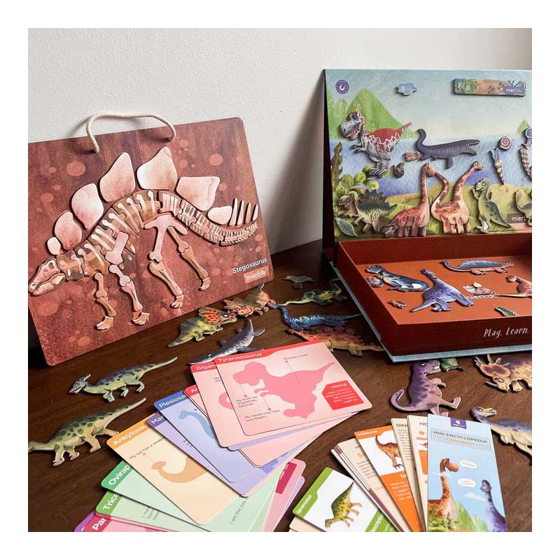 Περιλαμβάνει ένα μαγνητικό ταμπλό παιχνιδιού με απολιθώματα, 14 κάρτες με στέκα δεινοσαύρων και 84 μαγνήτες για μια καθηλωτική μαθησιακή εμπειρία.