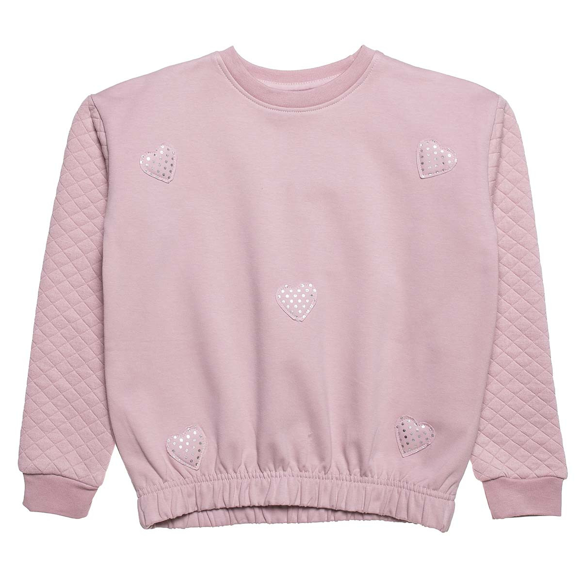 Μπλούζα με καπιτονέ σχέδιο στα μανίκια, απλικέ καρδιές με γυαλιστερές λεπτομέρειες και λάστιχο με σούρα στο κάτω μέρος.