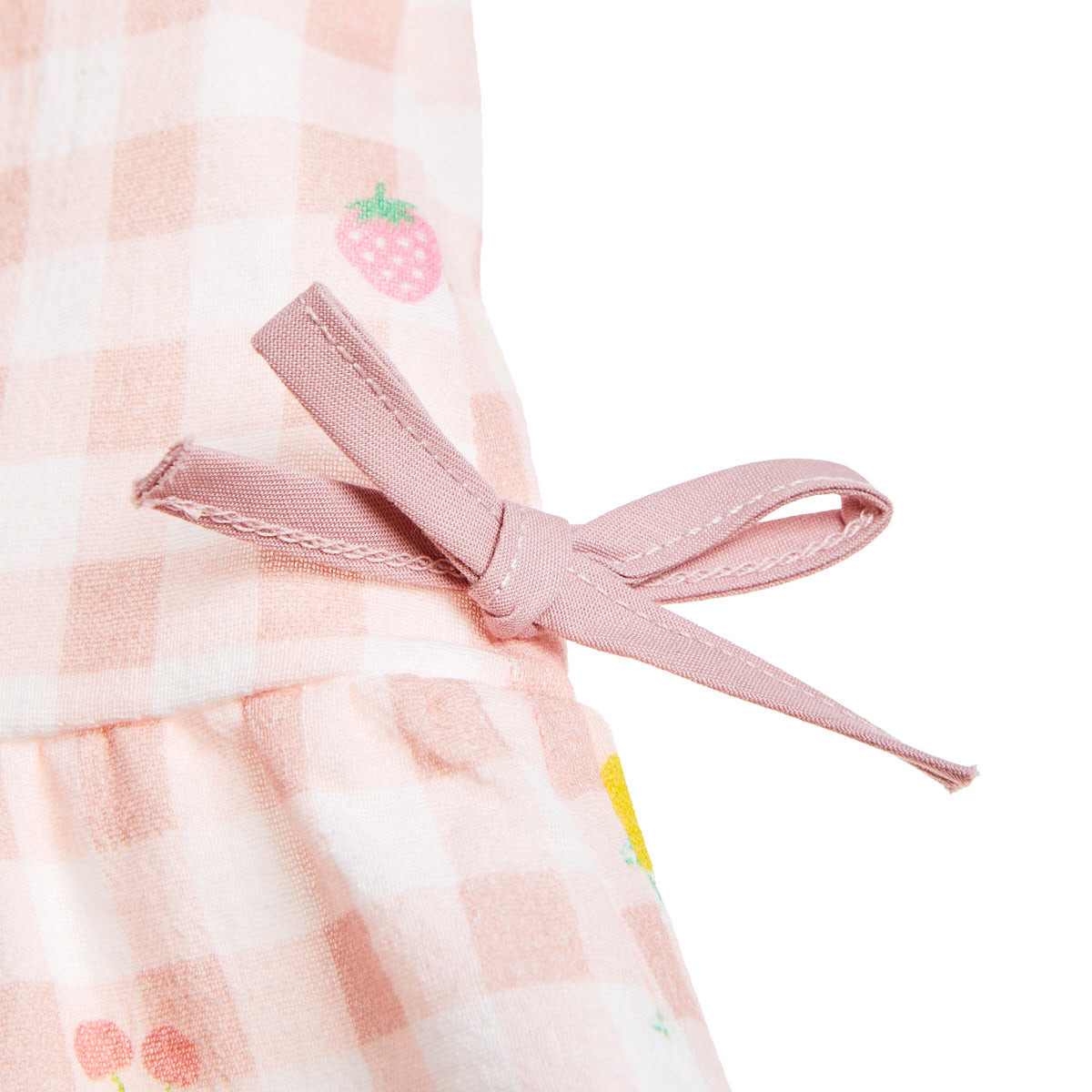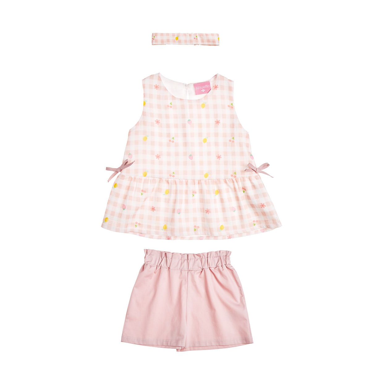 Σετ απο 100% βαμβακερό ύφασμα, αποτελούμενο απο μπλούζα, σορτς και ασορτί κορδέλα για τα μαλλιά.