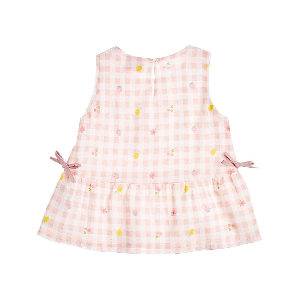 Μπλούζα με φόδρα, με ελαφρώς εβαζέ κάτω μέρος, διακοσμητικά φιογκάκι στο πλάι, μικρό άνοιγμα στην πλάτη με κουμπί και καρό μοτίβο.