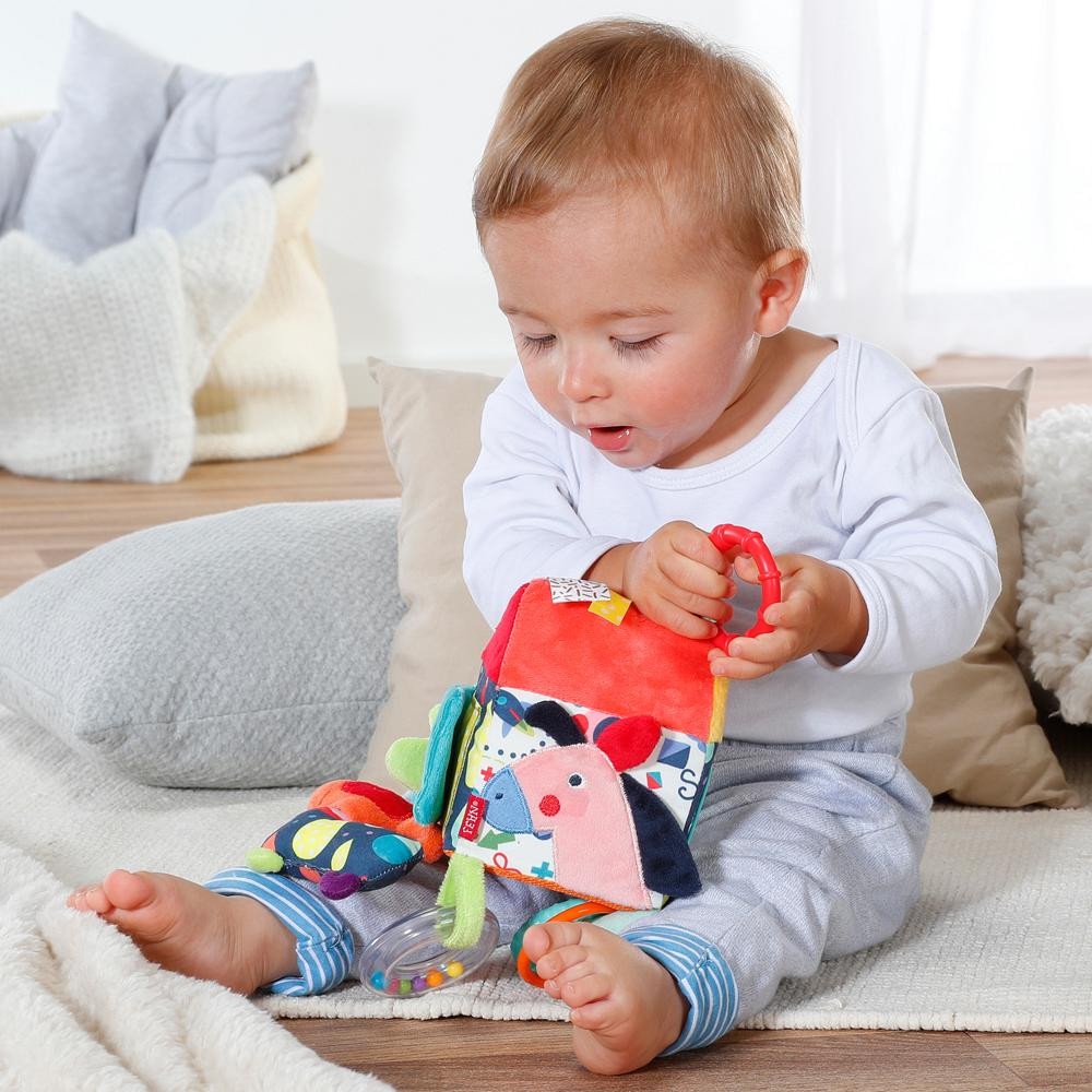 - Το μωρό μαθαίνει πρώτα την αυτογνωσία με τον μικρό καθρέφτη και δημιουργεί αστείους ήχους με το δαχτυλίδι κουδουνίσματος, το τσαλακωμένο χαρτί και το κρυφό dingdong