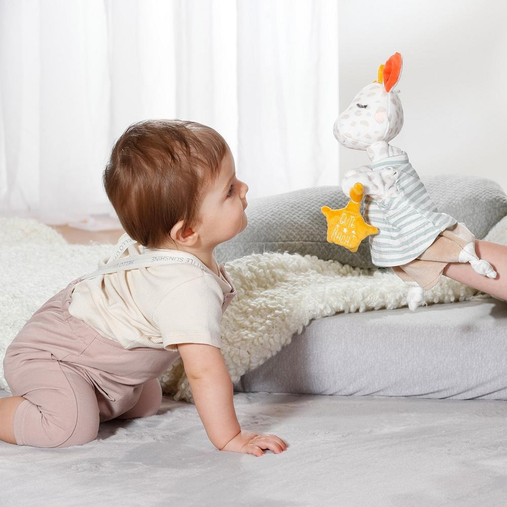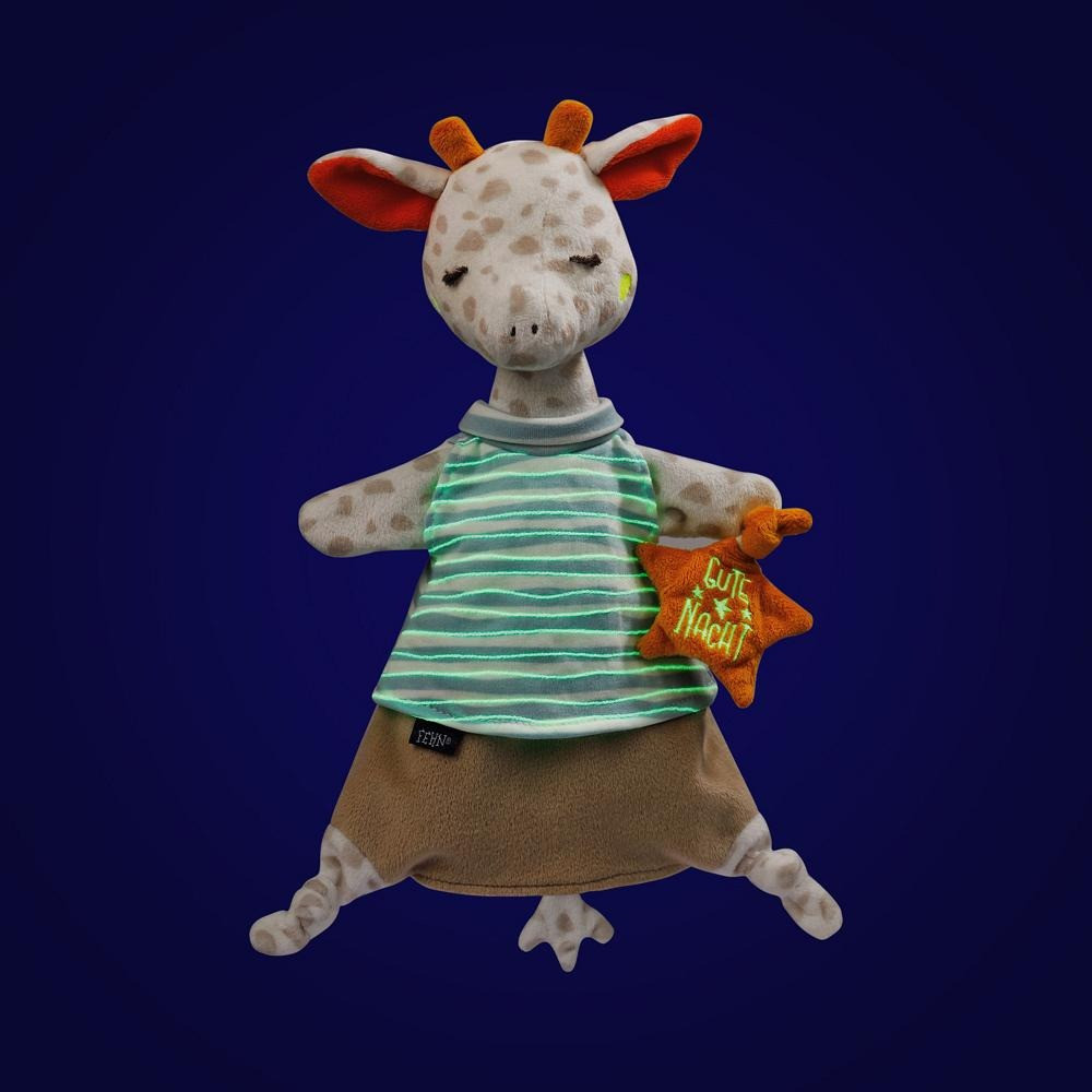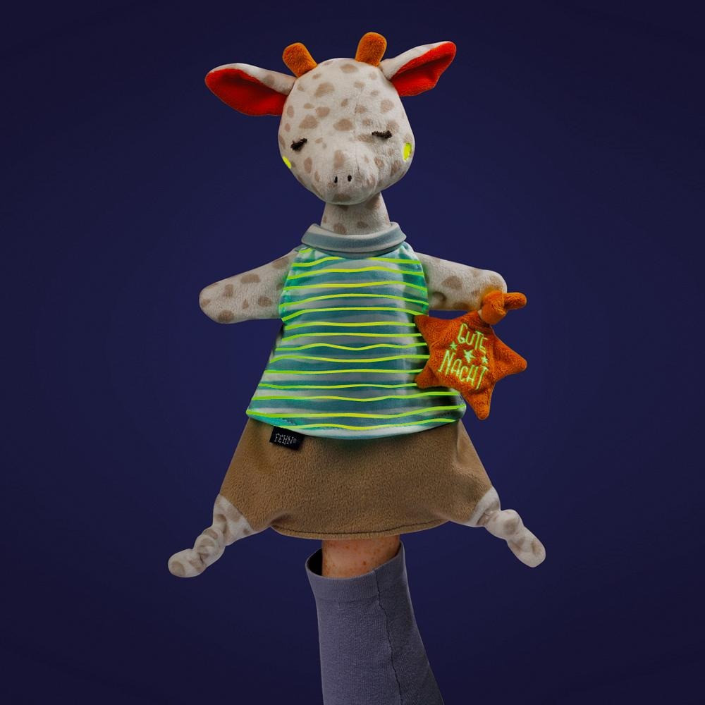 Για το τέλειο παραμύθι πριν τον ύπνο: Ως πάπλωμα και μαριονέτα χειρός, η καμηλοπάρδαλη είναι ένα εξαιρετικό βοήθημα ύπνου - τα στοιχεία "φωτεινό στο σκοτάδι" απομακρύνουν τον φόβο του μωρού για το σκοτάδι και του μεταφέρουν μια αίσθηση ασφάλειας.