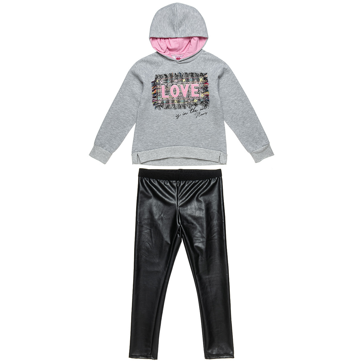 Η μπλούζα διαθέτει κουκούλα, εντυπωσιακό πολύχρωμο κέντημα με patch lettering "Love" στη μπροστινή όψη. Έχει λάστιχο στο τελείωμα των μανικιών και ασύμμετρο κόψιμο με μακρύτερο το πίσω μέρος. Το κολάν έχει ωραία εφαρμογή και λάστιχο στη μέση για σταθερότητα.