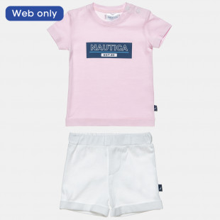 Dress with a combination of fabrics. Sweatshirt top with embroidery and elastic rips at the ends.