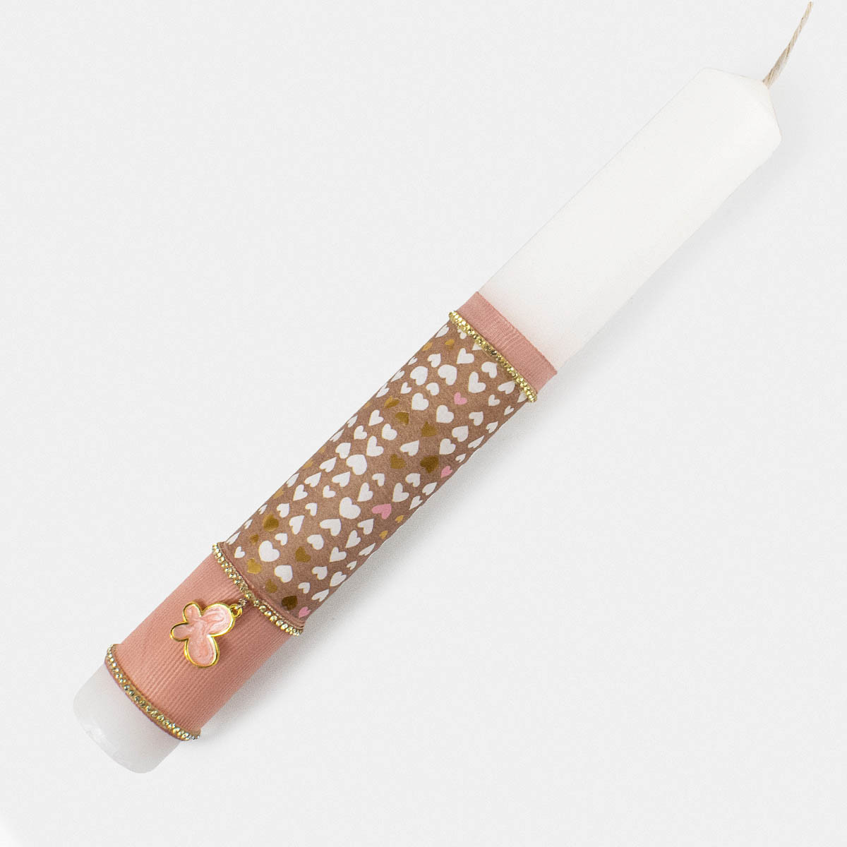 22cm candle with decoupage hearts, rhinestones and a decorative metal butterfly.