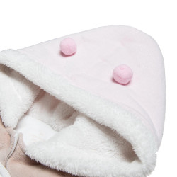 Velvet jumpsuit for girls from the Tender Comforts collection. It features a hood lined with eco-friendly fur, 2 small heart-shaped fur pockets and embroidery on the front. It opens in front with snaps down to the legs, to make it easier for the parent to change the baby. Hood with pom-pom on top. It is soft, comfortable and warm as well as the most... }