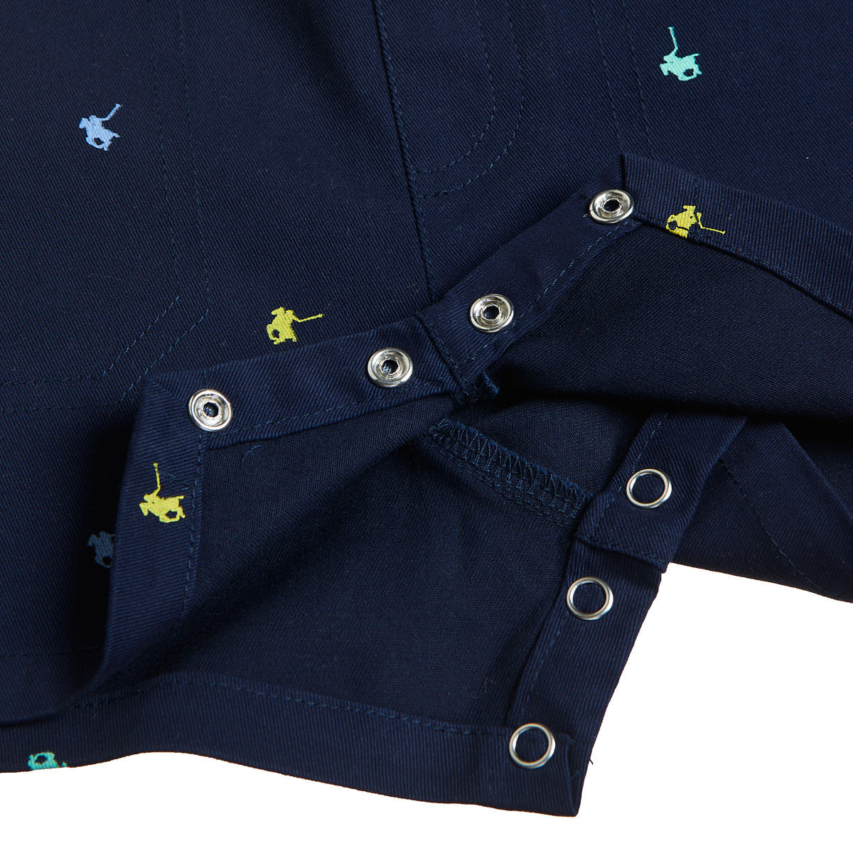 Print on the front, snaps at the bottom for easier changing and snaps at the back.