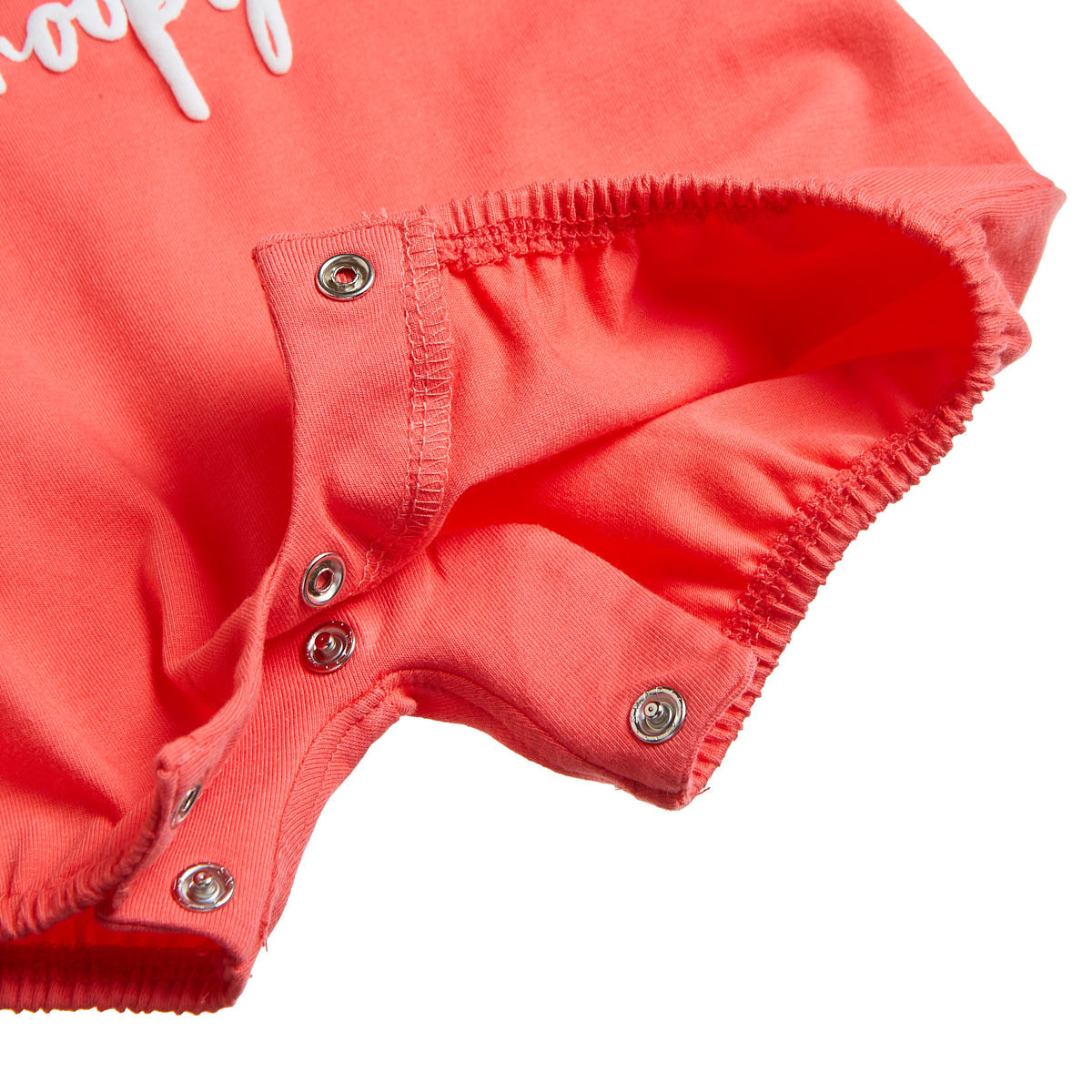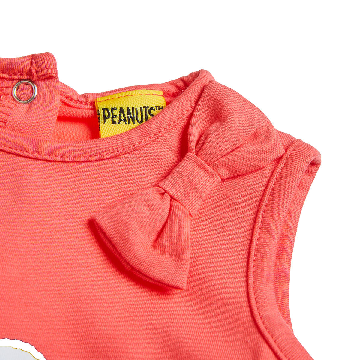 Snoopy cotton bodysuit with decorative bows on the shoulders adding an elegant, romantic touch.