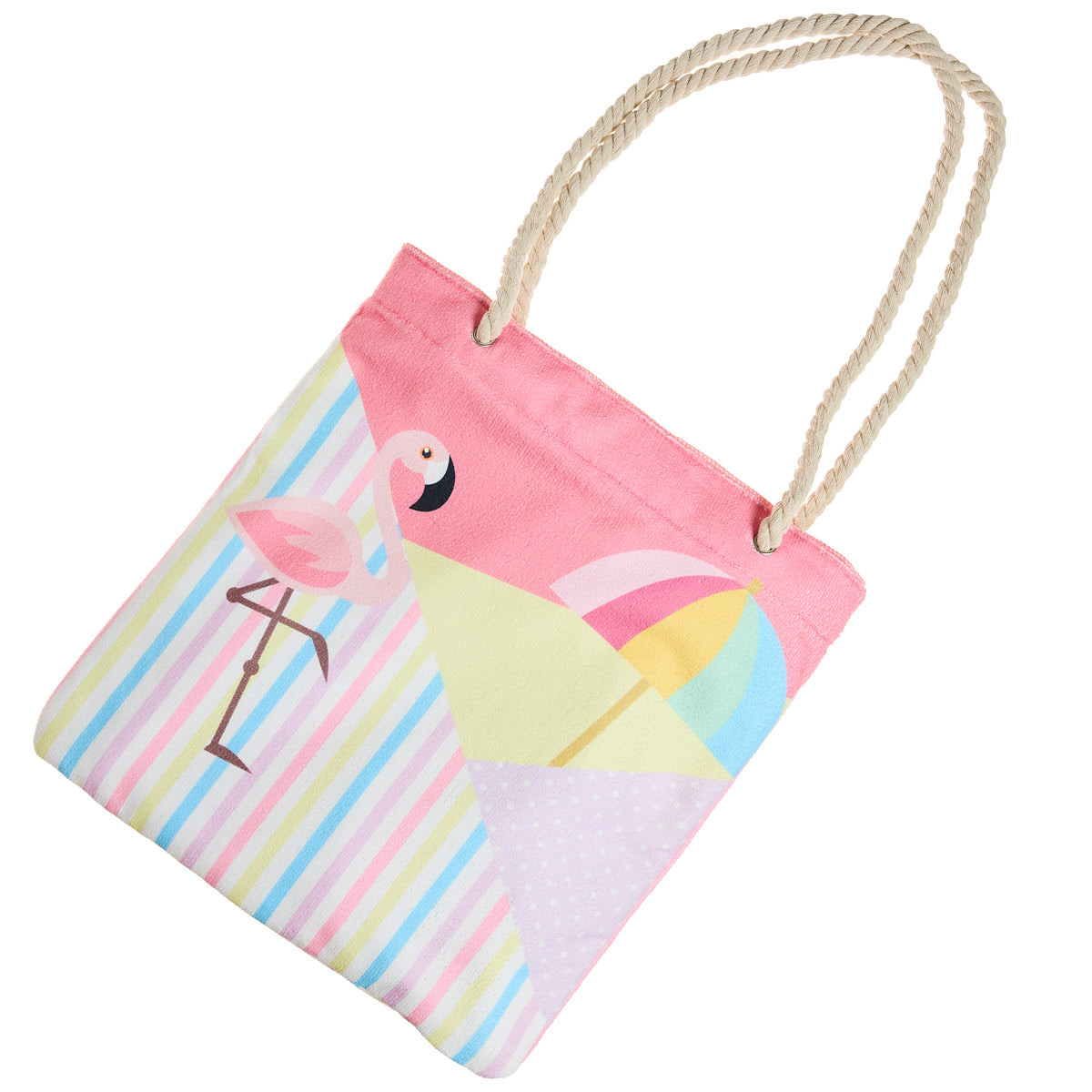 True Blue beach towel bag that converts into a shoulder bag with a flamingo design.