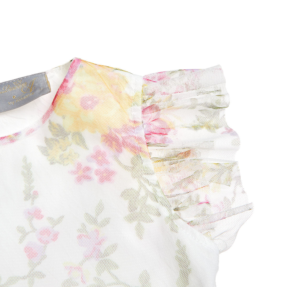 Dress with floral pattern, ruffles on the sleeves, layers of tulle and cotton lining on the inside for more volume.