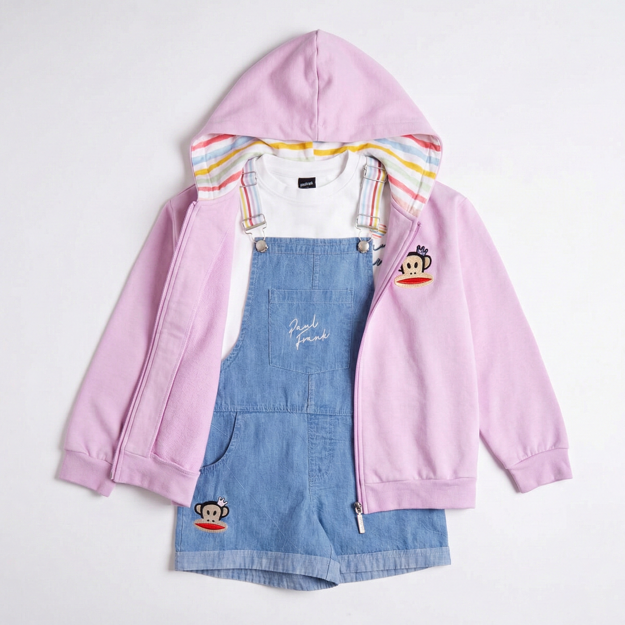Paul Frank jacket made of lightweight, lint-free sweatshirt fabric, with a striped pattern on the inside of the hood. Embroidery on the front and back. }
