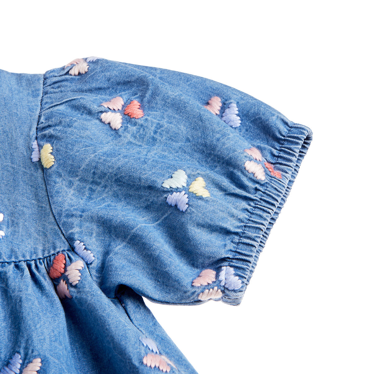 Dress made of extremely soft, 100% cotton denim fabric, with embroidered details and buttons at the front.