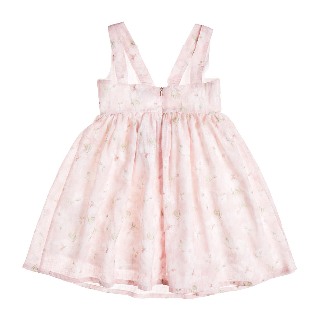 Dress made of lightweight fabric with a floral pattern, a decorative bow at the front and a zipper at the back.