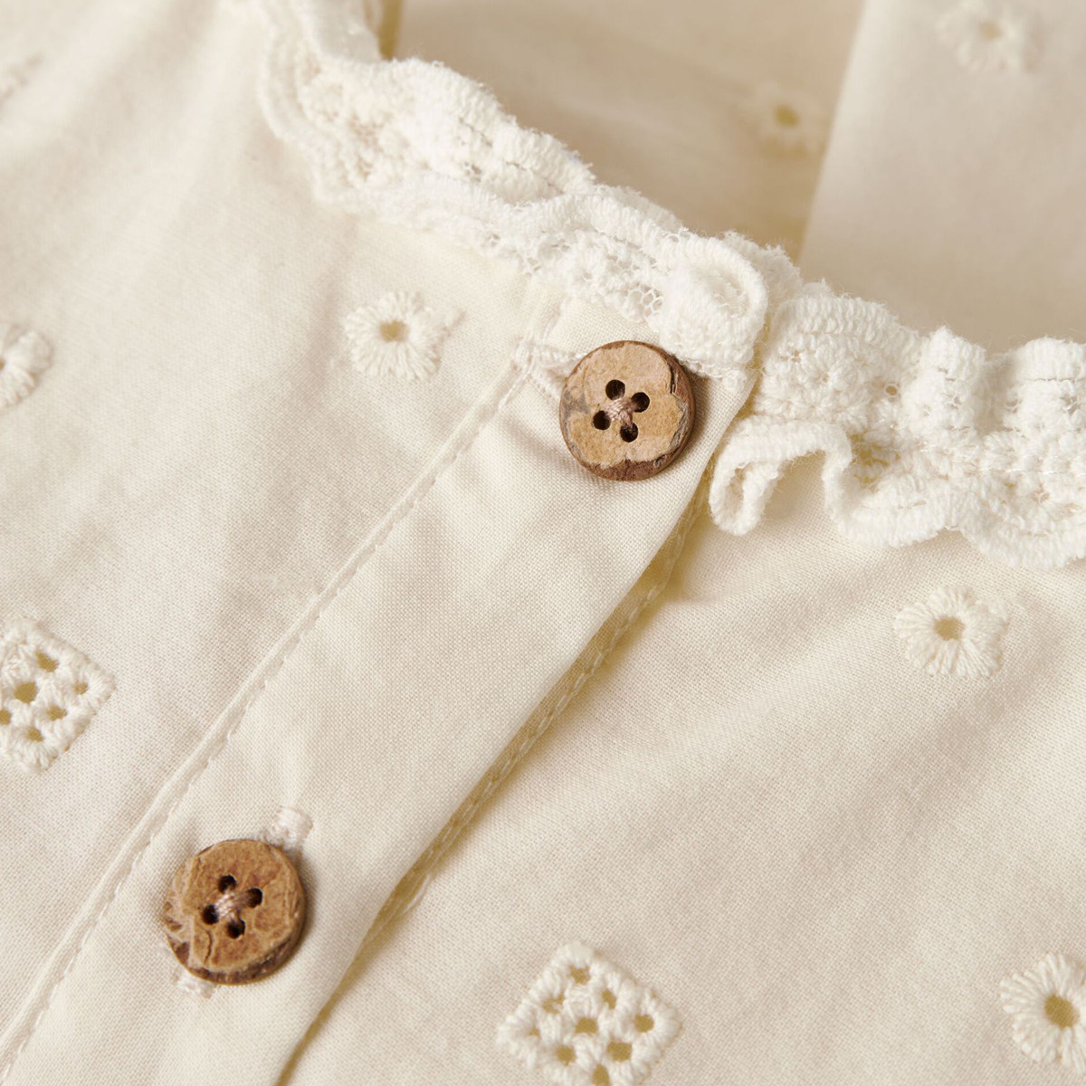 Short sleeves with elastic with ruching at the end, perforated embroidered elements and inner bodysuit with studs at the bottom for greater ease in changing the baby.