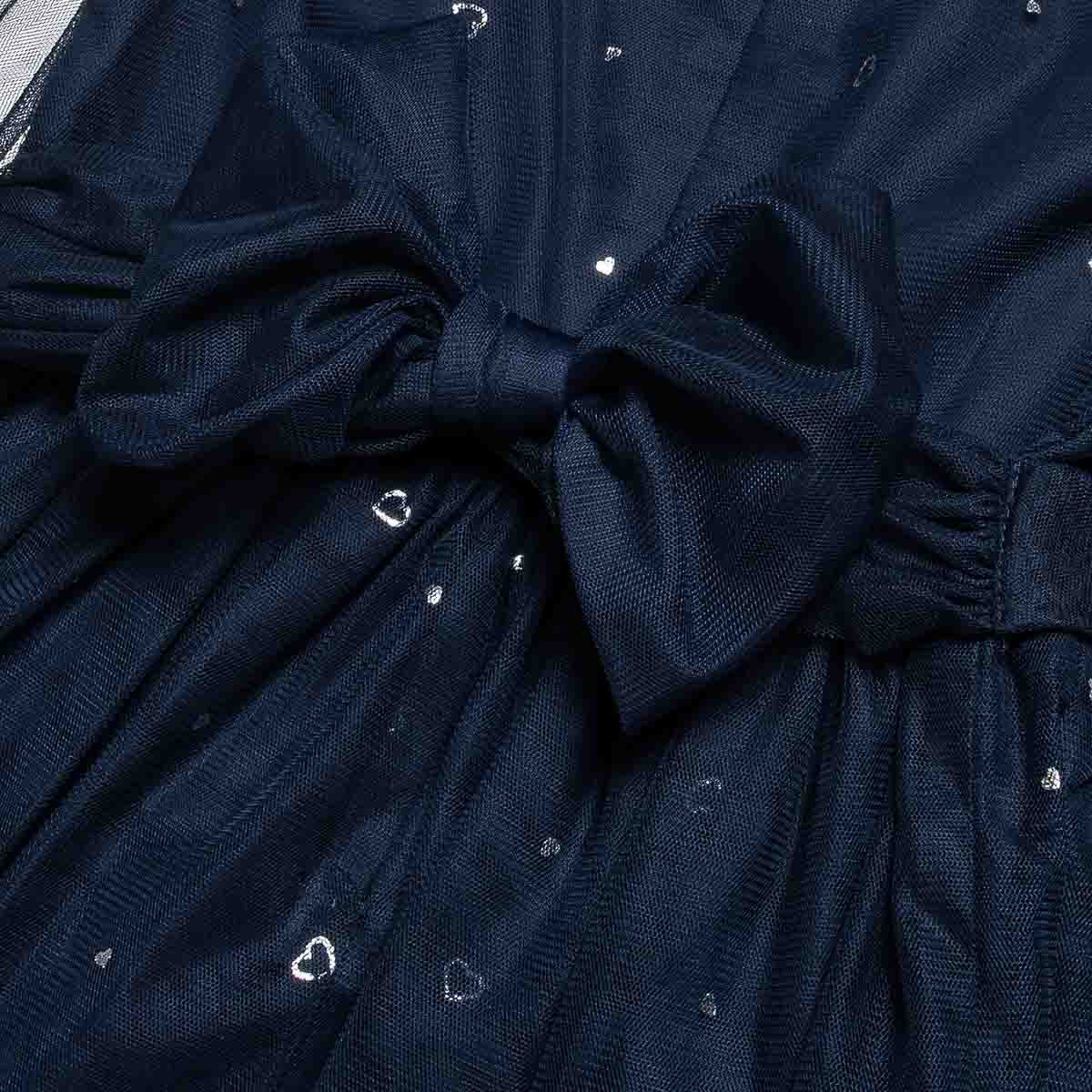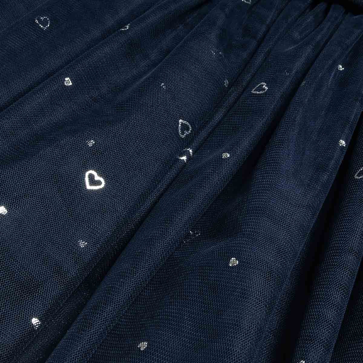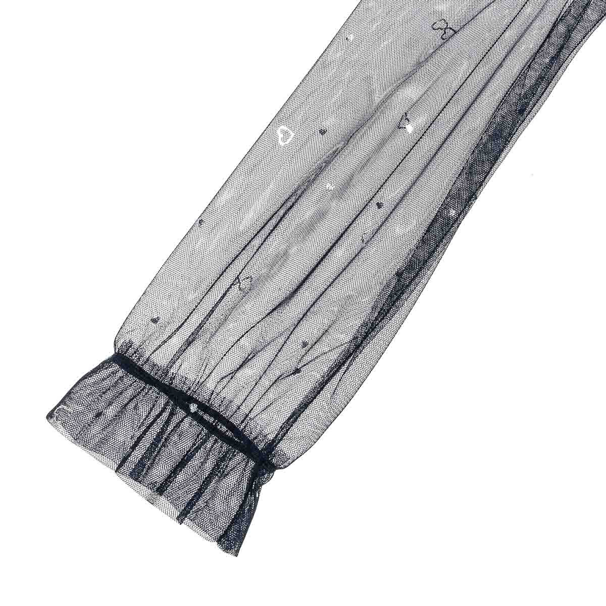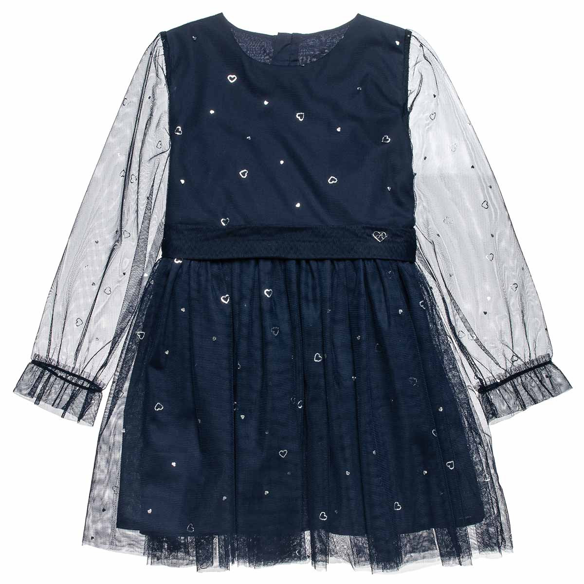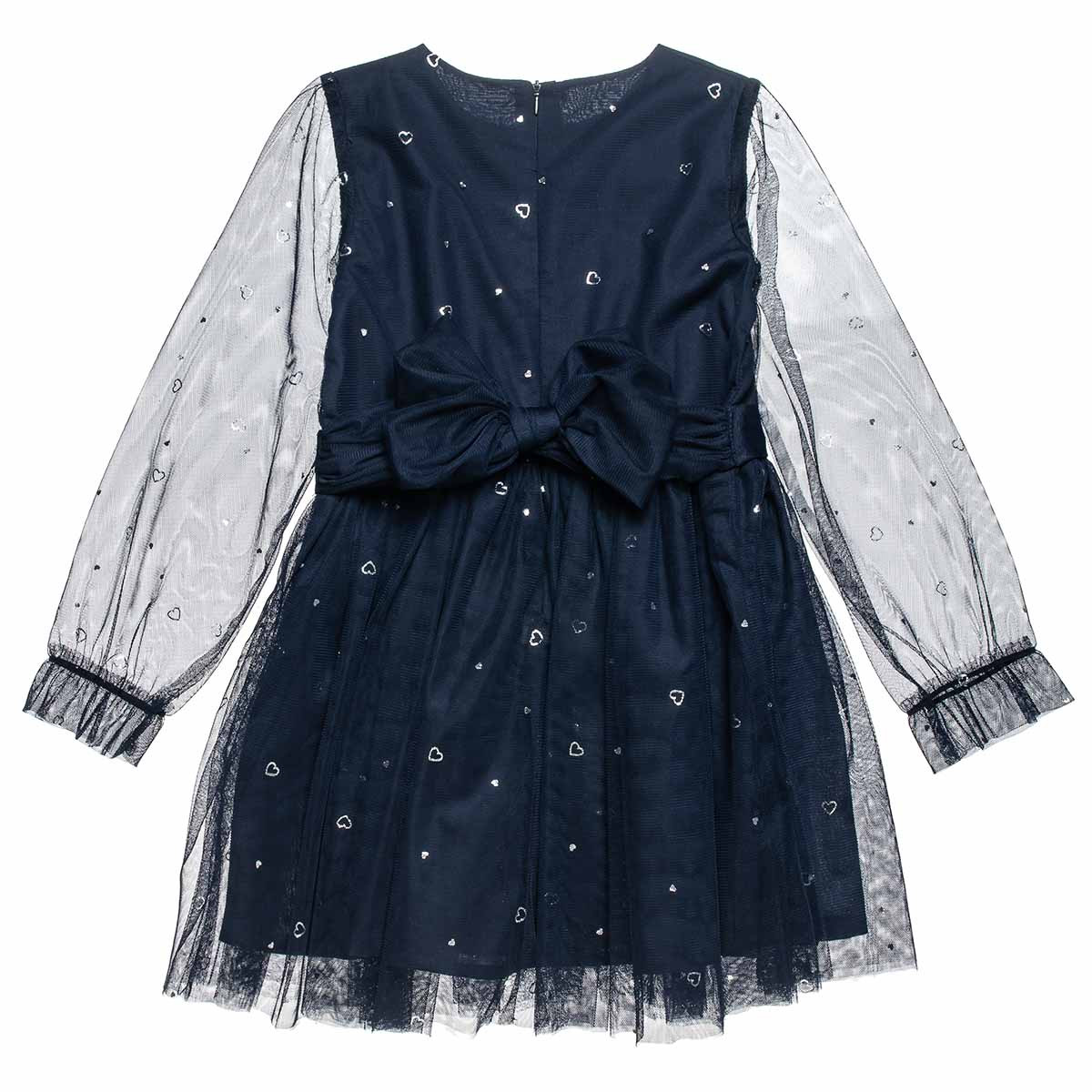 Sheer sleeves and a pattern with shiny silver hearts.