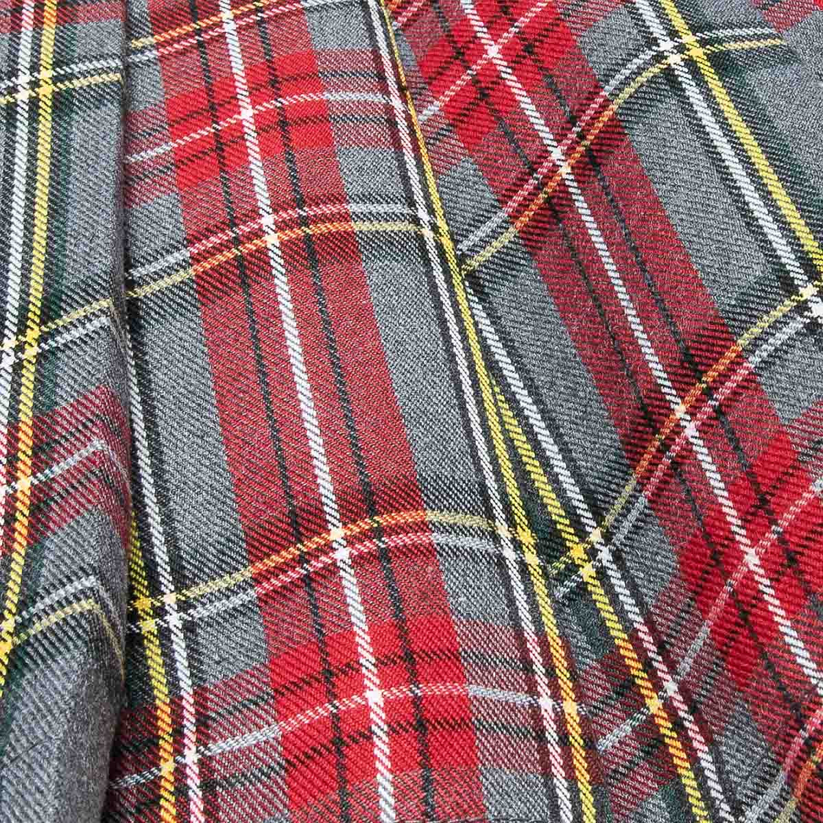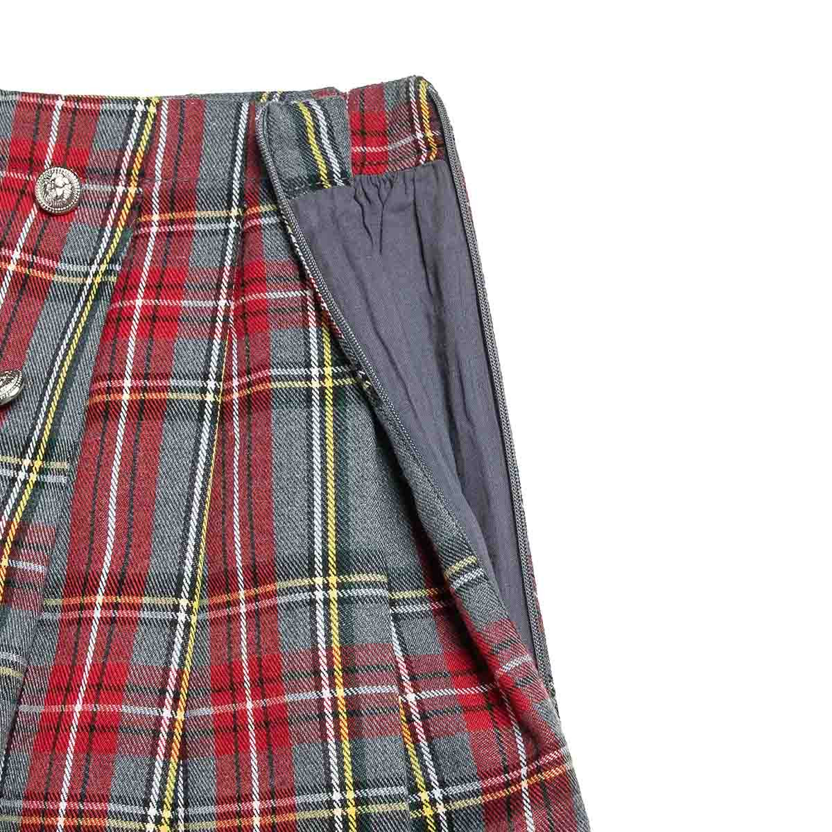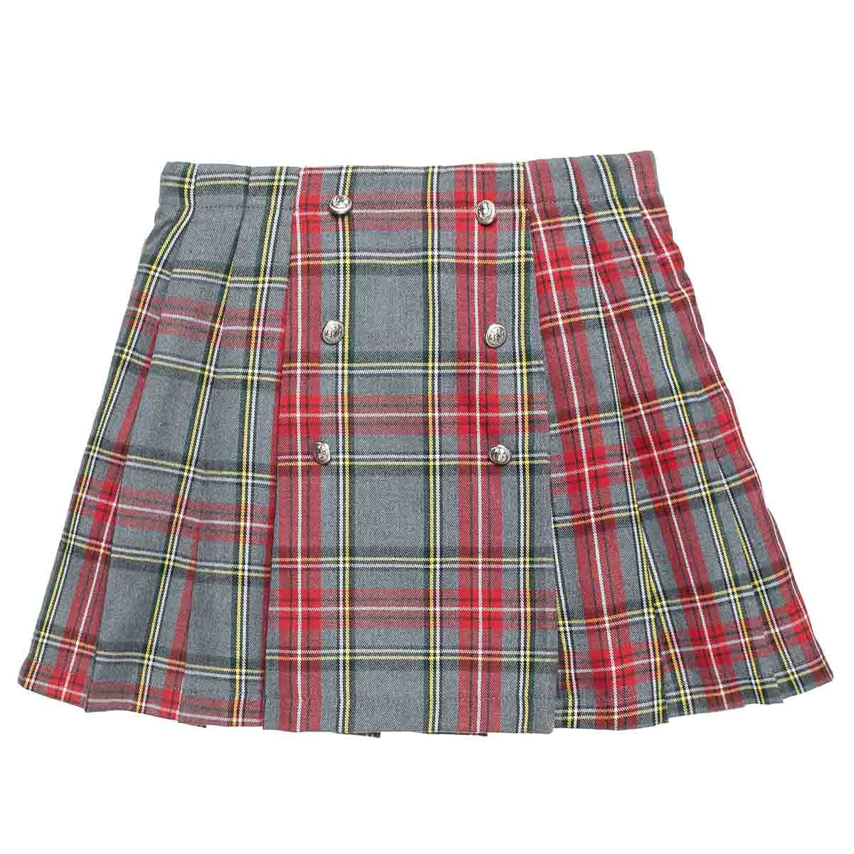 Plaid skirt with pleats and decorative metal buttons on the front.