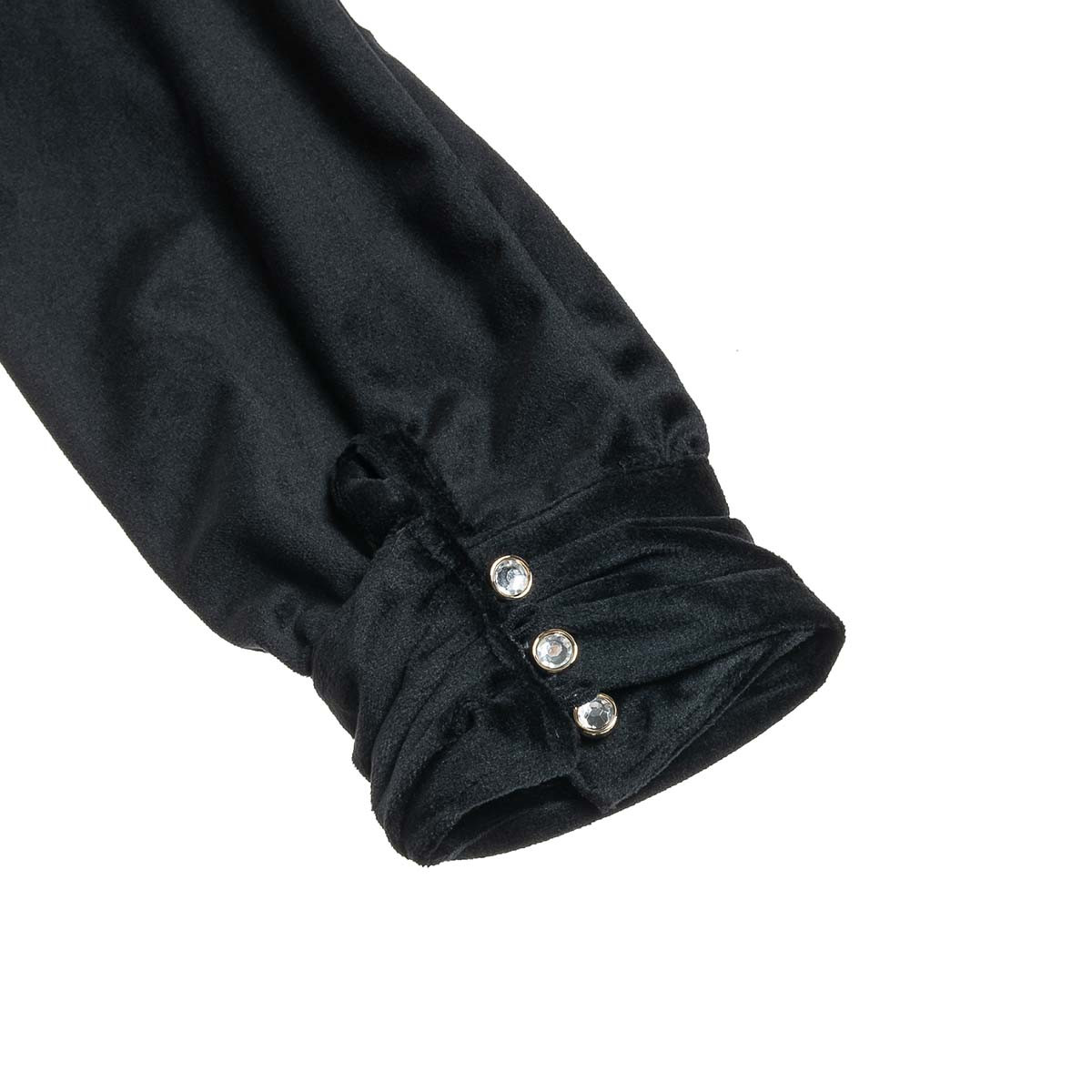 Closes with a zipper in the back and ruffles at the end of the sleeves with shiny buttons at the end.