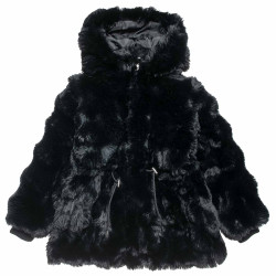 Jacket made of extremely soft eco-fur with hood and front zipper. Side pockets and ribbed cuffs. }