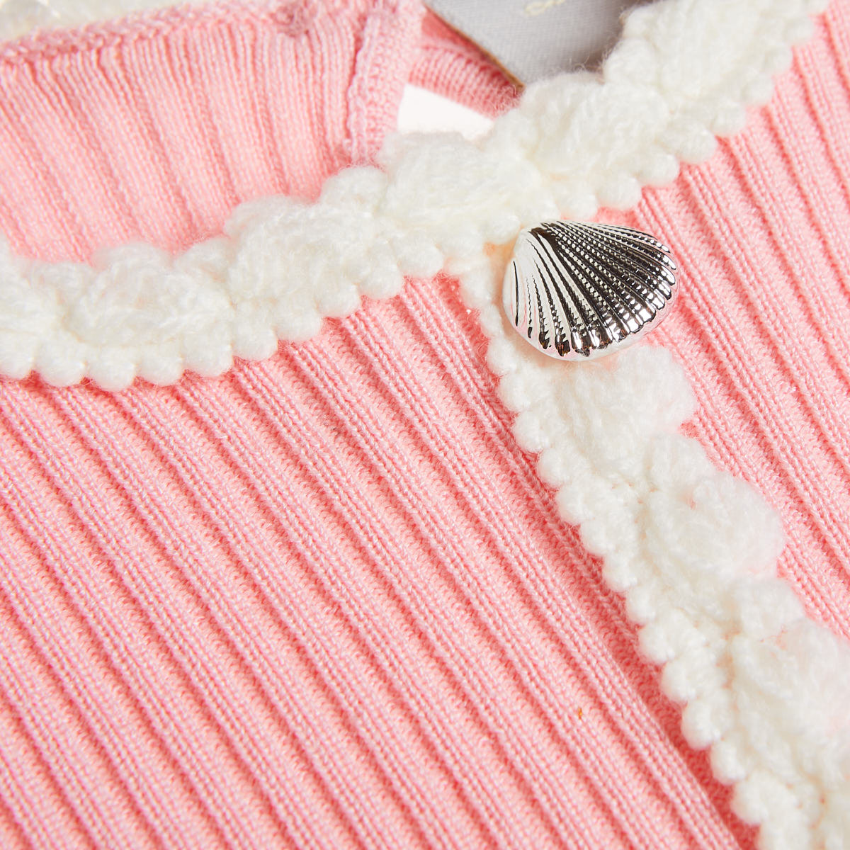 Embroidered details, decorative shiny buttons and a small opening at the belly.