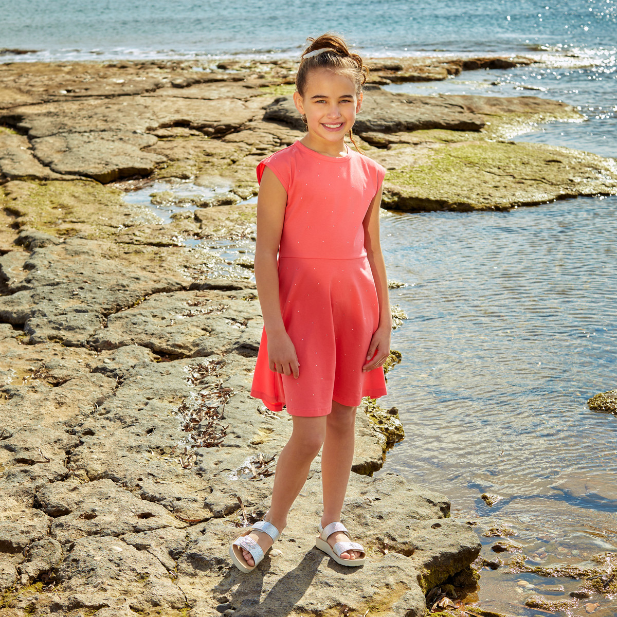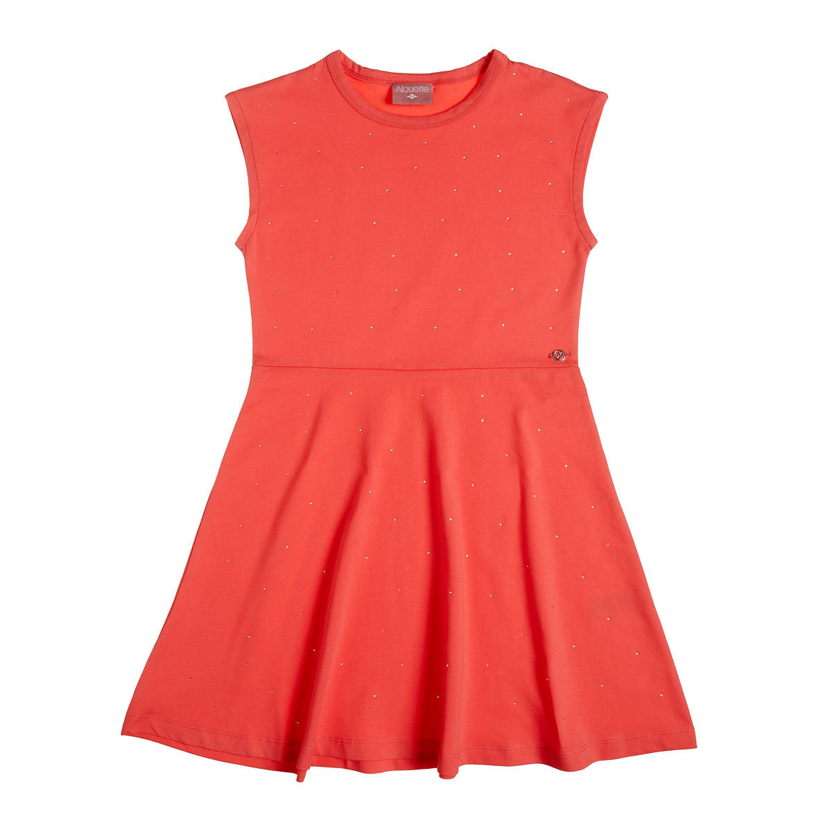 Sleeveless cotton dress with rhinestones on the front.