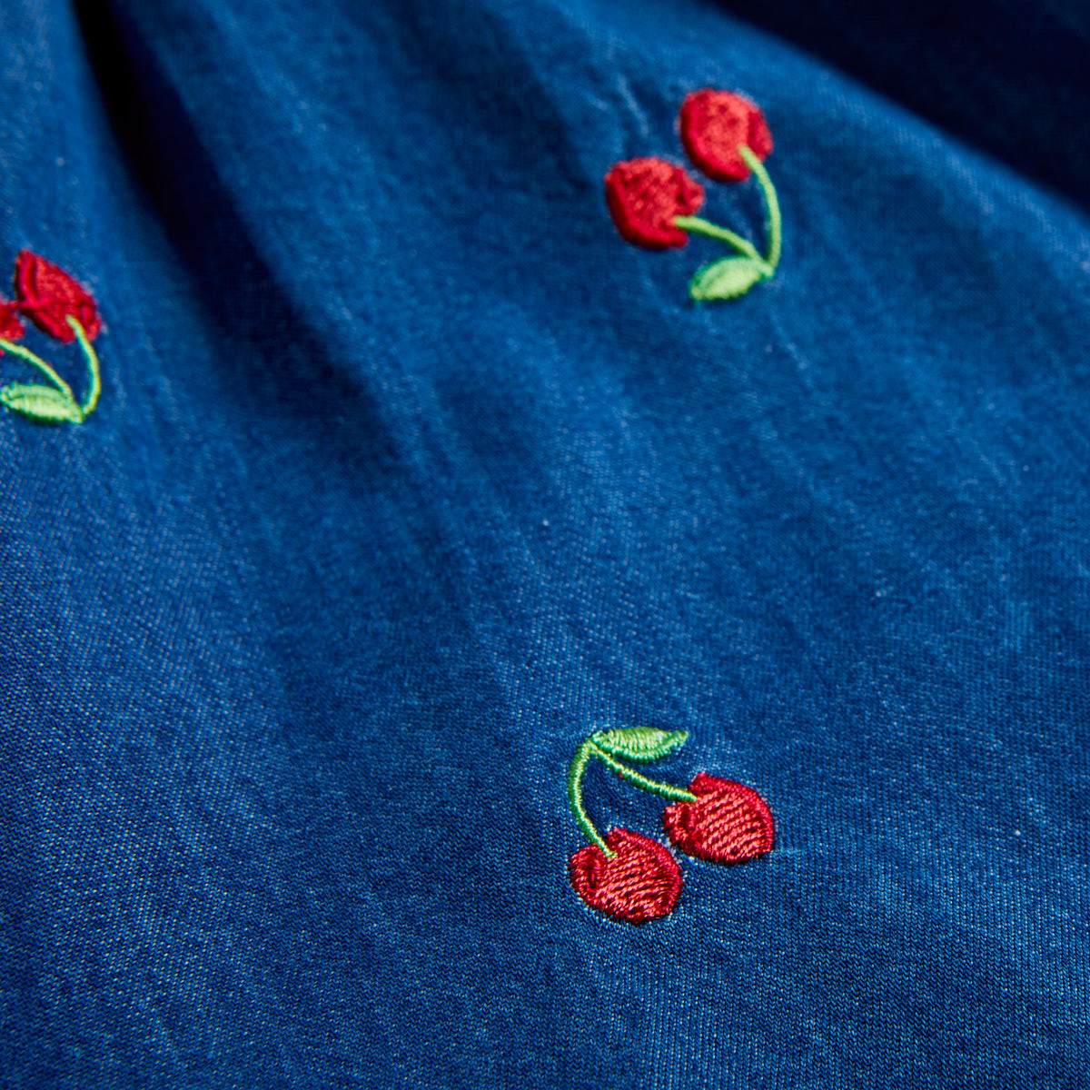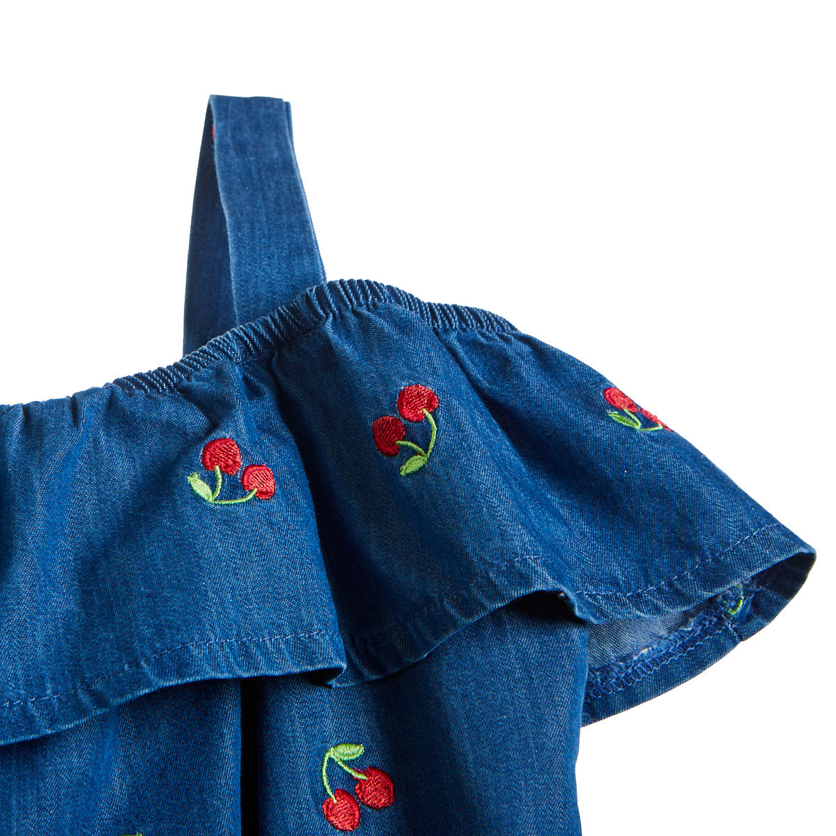 Ruffles at the bust, elastic with seam at the waist and embroidered elements all over.