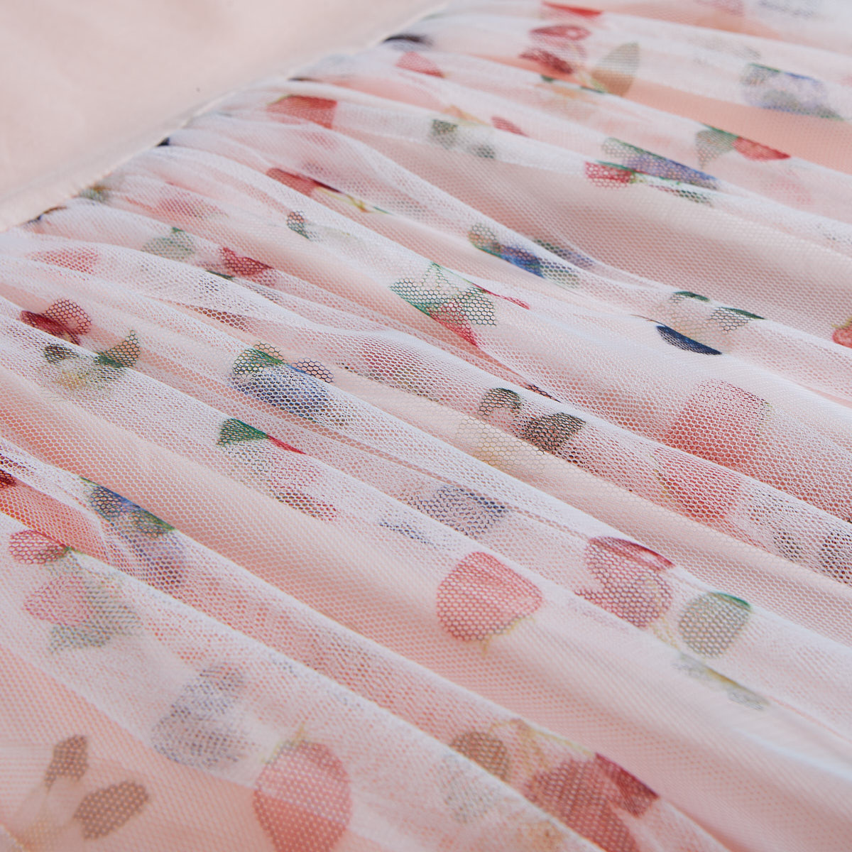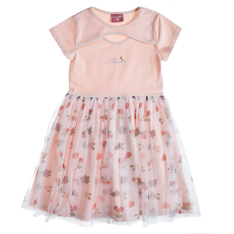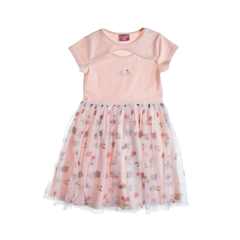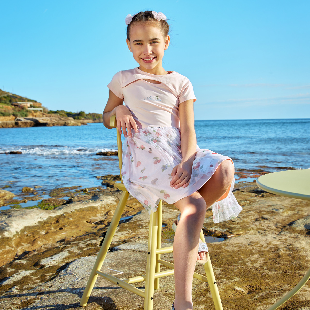 Short sleeves and a voluminous tulle bottom with a cotton lining that gives impressive movement.