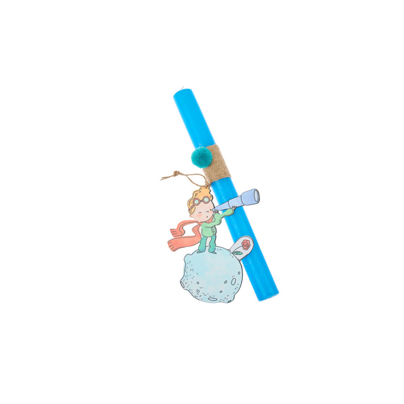 The Little Prince candle consists of a light blue candle covered with thread and pom poms and a 15cm little prince wooden decorative magnet.