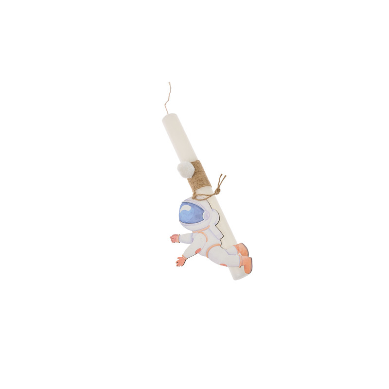 The astronaut Easter Candle consists of a white candle covered with thread, a pom pon and a 15cm wooden decorative astronaut magnet.