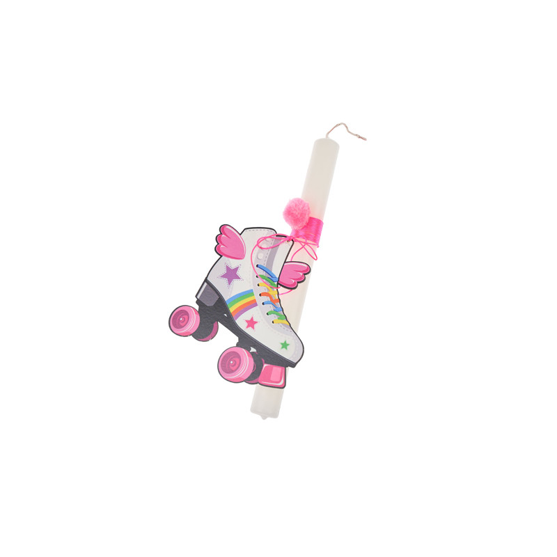 Easter Candle with white candle, dressed with pink thread, pom pon and with decorative magnet rollerblades.