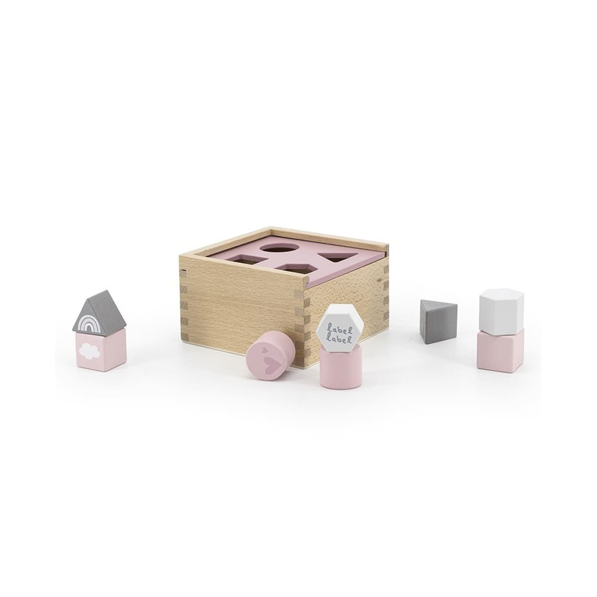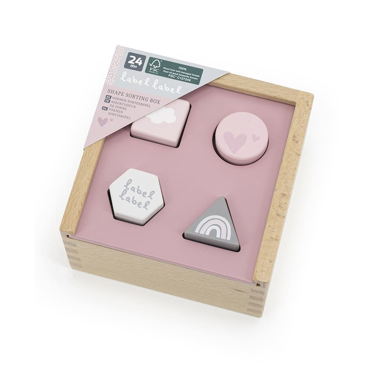 The Label Label shape sorting box is made of high-quality FSC certified beech wood and was painted in trendy pink, white and grey shades and symbols using child-friendly water based paint.