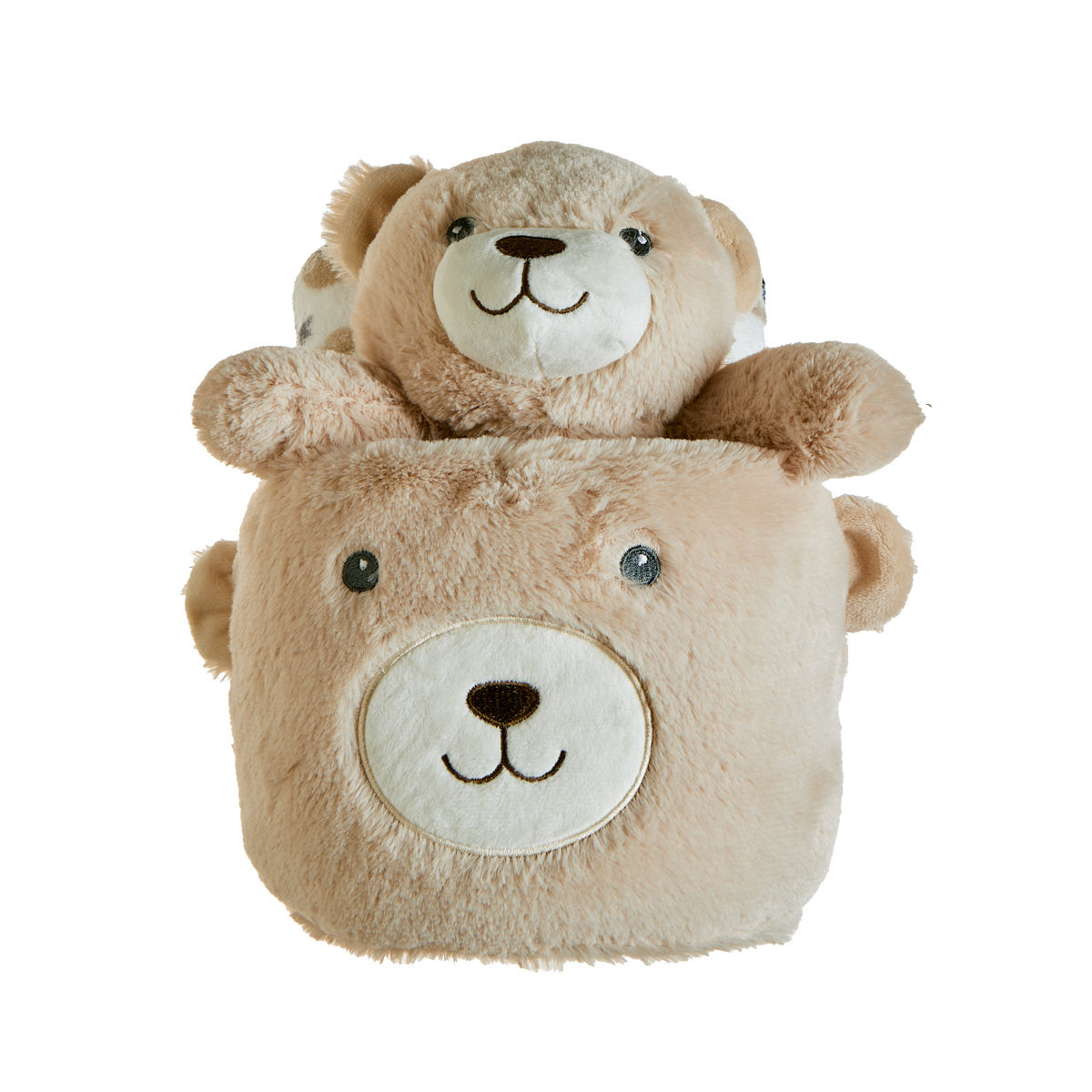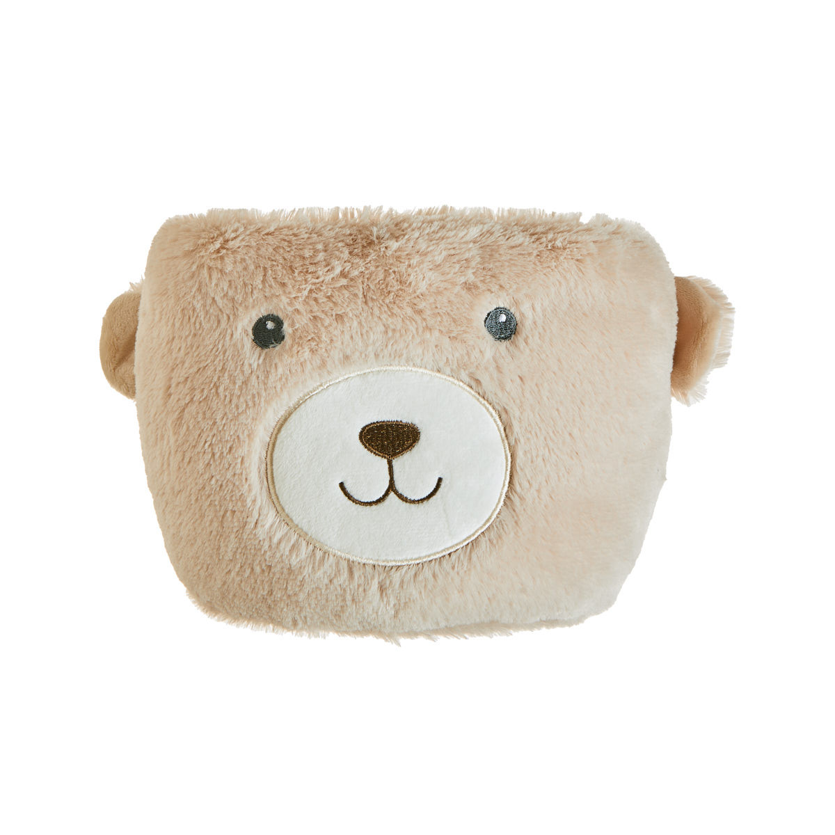 Basket with a soft, fluffy texture and decorative ears and snout, for storing baby accessories and basic items.