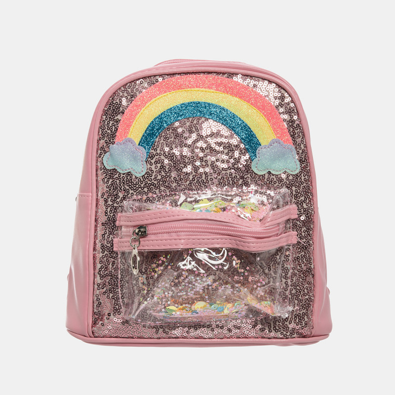 - A small zippered pocket on the front, decorated with sequins and confetti