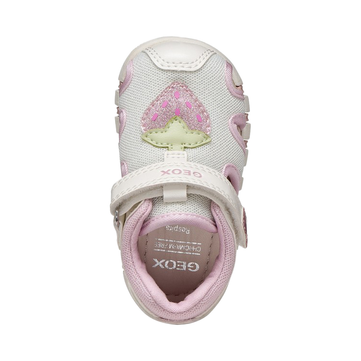 They come in white and pink, have an upper decorated with strawberry appliqué and a comfortable strap closure.