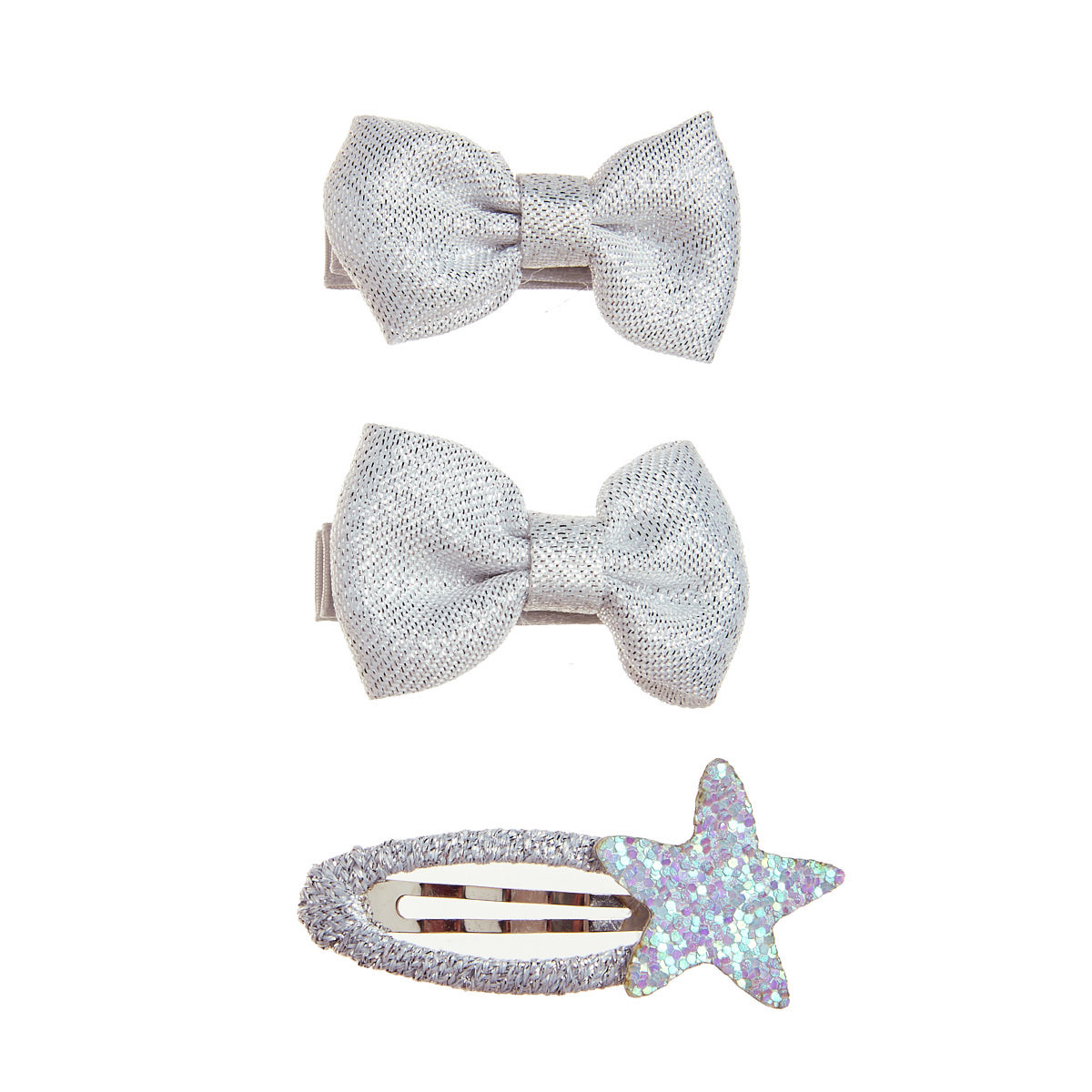 Hair clips, set of 3 pieces, with shiny and glitter elements.