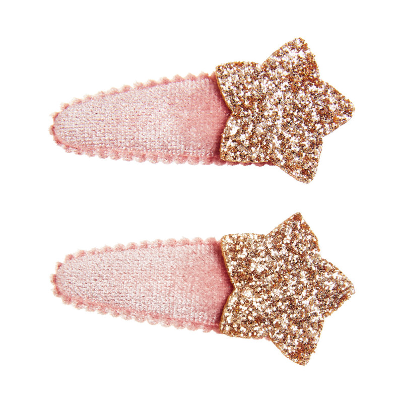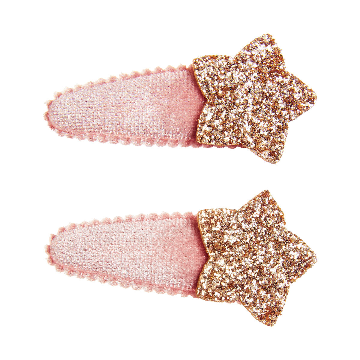 Hair clips, set of 2, covered with velvet fabric and star applique with glitter effect.