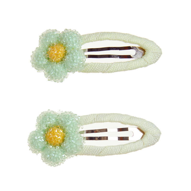 Hair clips, set of 2, covered with fabric and appliqued flower with glitter effect.