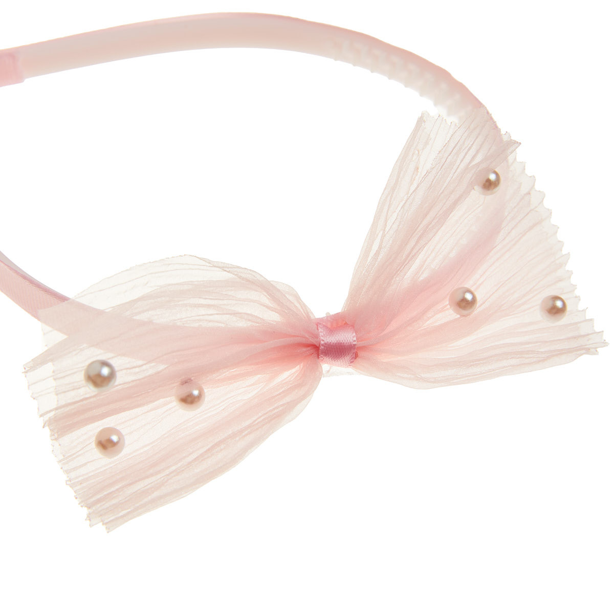 Hairband covered in fabric and decorated with a tulle bow with pearls.