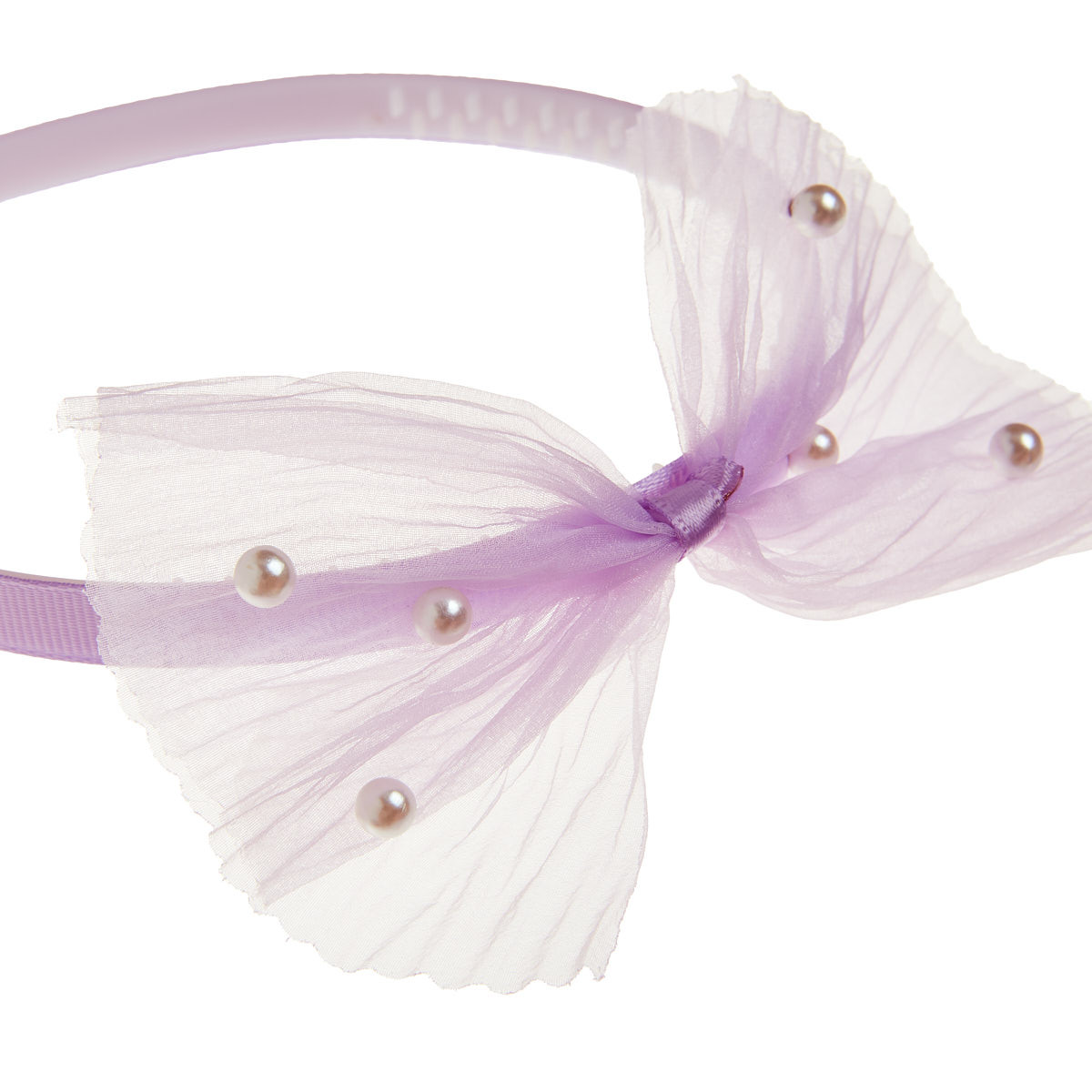 Hairband covered in fabric and decorated with a tulle bow with pearls.