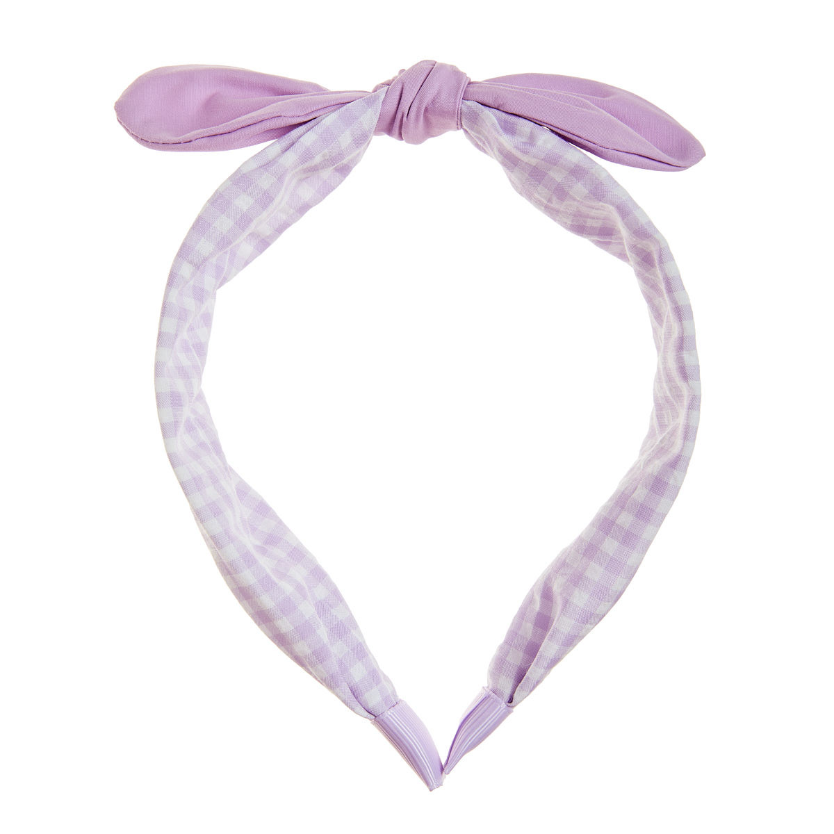 Wide hairband, covered in plaid fabric and with a bow at the top.