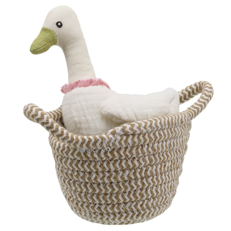 An adorable linen animal in soft colors, accompanied by its own little basket.