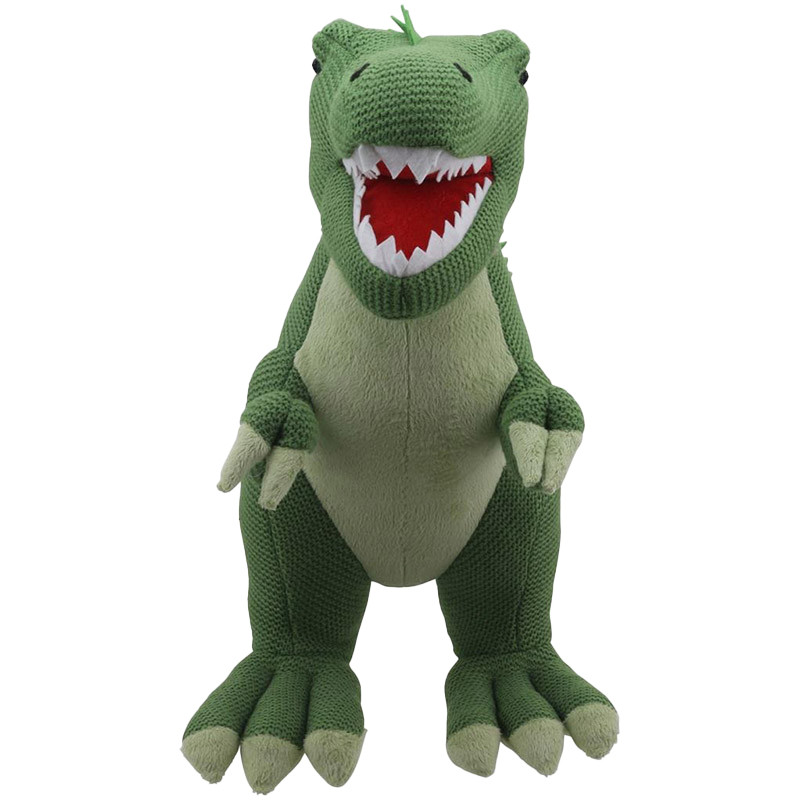 The large green knitted T-Rex is a striking dinosaur piece that makes an impression.