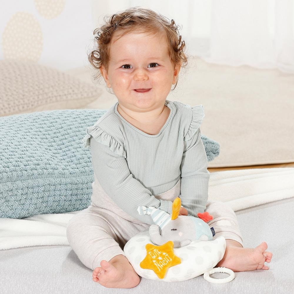 The cute elephant on the moon is not only an ideal sleeping aid, but can also be easily attached to the crib, stroller or child seat thanks to the two straps – the perfect companion!